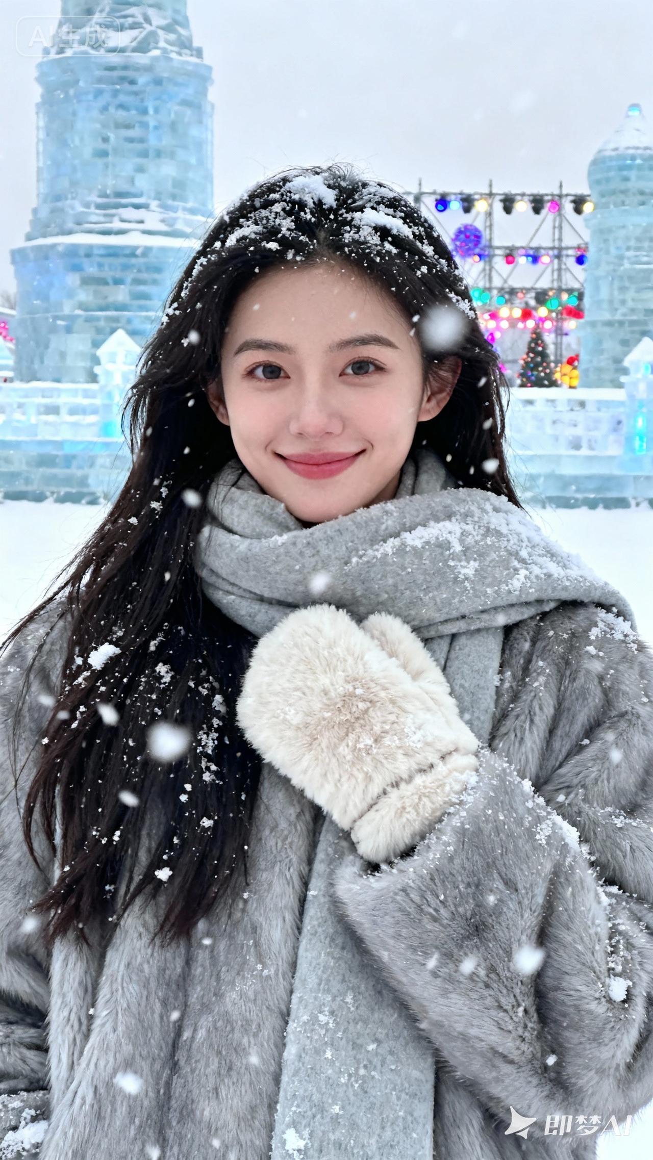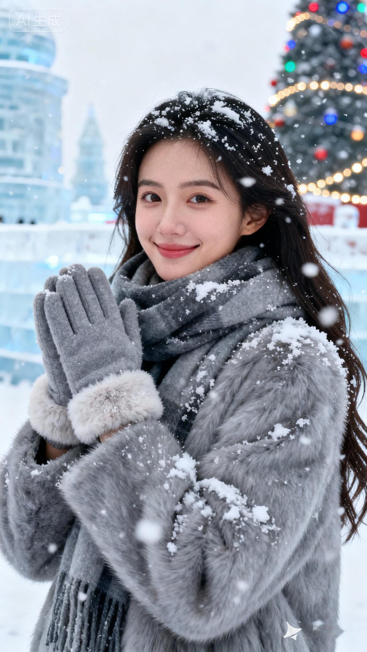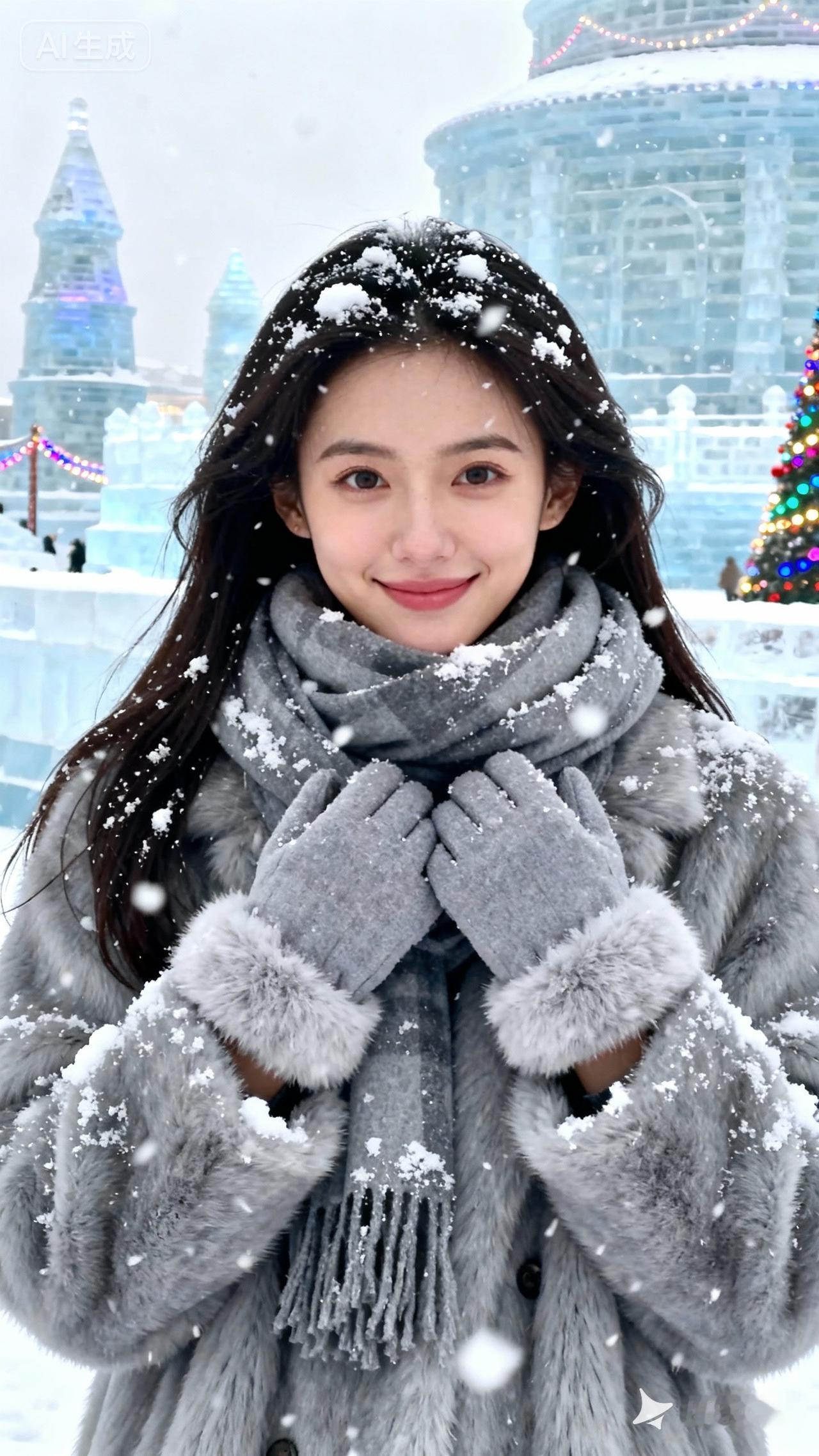 冬日暖阳下的雪景,甜美笑容的少女,仿佛置身童话世界。
