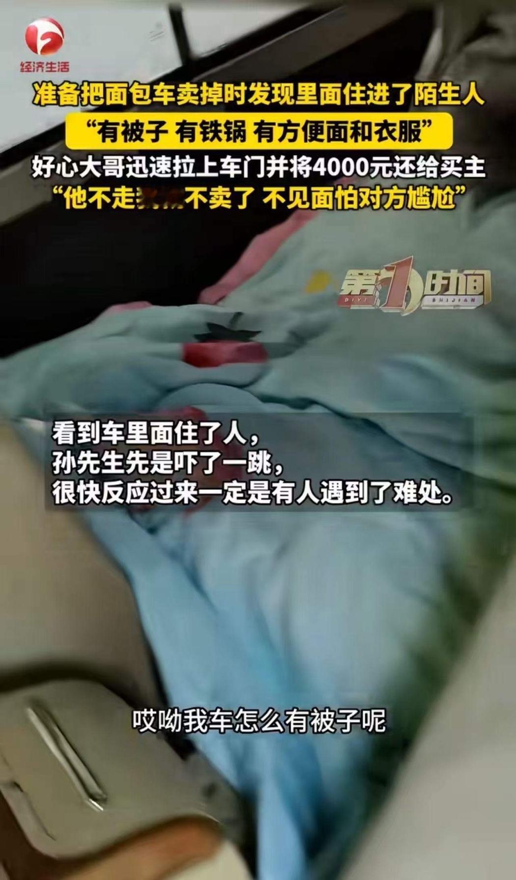 “这个大哥真是大好人!”河南周口,大哥准备把面包车卖掉,发现里面居然住了一个陌生人,里面有被子有铁锅有方面和衣服,大哥迅速将车门拉上,而他接下来的做法,让人不禁为之泪目!网友:真的大爱!一般人做不出来! 面包车里的“不速之客”,引出暖心善举 “这个大哥真是大好人!”近日,河南周口发生的一件事,如同一束温暖的光,穿透网络,照亮了无数人的心房,网友们纷纷为故事中的大哥点赞,直呼其充满大爱,所作所为非一般人能及。 故事的主人公是一位朴实善良的大哥,他打算卖掉自己那辆陪伴多年的面包车。当他打开车门,准备对车辆进行一番整理时,眼前的景象让他着实吃了一惊——车内竟住着一个陌生人!狭小的空间里,被子随意地铺着,旁边还放着铁锅、方便面和几件破旧的衣服,显然,这个陌生人把这里当成了临时的“家”。 大哥的第一反应是迅速将车门拉上。或许在旁人看来,这可能是为了避免麻烦,担心这个陌生人的出现会给自己带来不必要的纠纷。然而,大哥接下来的做法,却完全出乎所有人的意料。 他并没有选择报警驱赶,也没有冷漠地置之不理,而是耐心地敲了敲车窗,轻声询问陌生人的情况。原来,这位陌生人遭遇了生活的困境,一时无处可去,才躲进了这辆面包车里。大哥听后,心中满是怜悯,他不仅没有责怪陌生人擅自占用自己的车,反而邀请他到家里吃顿热乎饭。 在大哥家里,大哥的家人也热情地招待了这位陌生人,为他准备了丰盛的饭菜。饭桌上,大哥一边安慰陌生人不要气馁,鼓励他重新振作起来,一边还塞给他一些钱,让他暂时解决生活上的困难。陌生人感动得热泪盈眶,他怎么也没想到,在这个陌生的地方,会遇到如此善良的一家人。 大哥的这一善举,被路过的邻居拍下来发到了网上,瞬间引发了网友们的热议。大家纷纷留言称赞大哥的善良和大爱,有人说:“在这个冷漠的社会里,大哥的行为就像一股暖流,让我们感受到了人间的真情。”还有人说:“大哥的善良不是一般人能做到的,他用自己的行动诠释了什么是真正的爱心。” 大哥用自己的实际行动告诉我们,善良是一种选择,是一种力量。它能在别人最困难的时候,给予温暖和希望。愿我们每个人都能像这位大哥一样,心怀善意,传递温暖,让这个世界变得更加美好。这个大哥真是大好人 自己的面包车里住了陌生人
