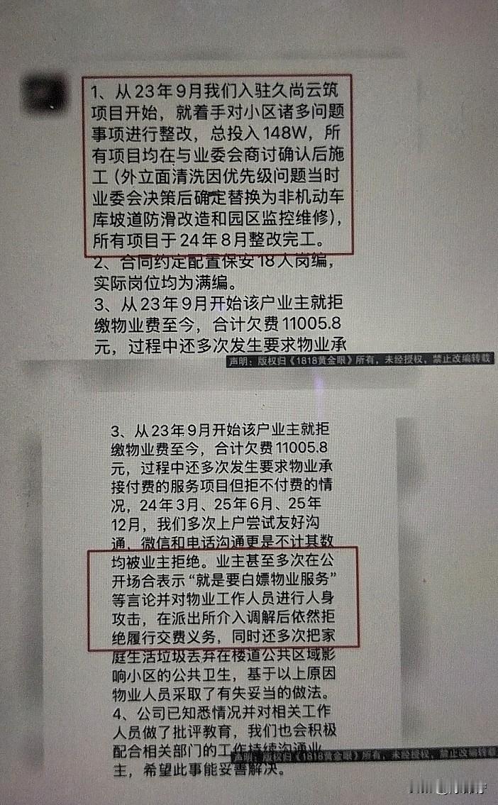 蚌埠住了!杭州临平陈先生拒交10000多物业费,物业直接把垃圾怼回他家门口,真相曝光后,是谁的错? 陈先生住久尚云筑,当初物业拍胸脯保证每年清洗外立面,结果两年多过去,窗户上的污渍肉眼可见,压根没看到清洗效果,他气不过就拒交了10000多物业费。 前几天他下楼扔垃圾,被保安拦住催费,他没搭理,转头回家就傻眼了,刚扔的垃圾全被搬回自家门口!第二天更过分,门口还堆了一堆不知哪来的别人家垃圾。 陈先生老婆当场气哭,直言这是赤裸裸的报复,明晃晃的欺负人,早就表态愿意走司法程序,该给多少给多少,还爆出料:“是物业先骂我们白嫖服务,甚至故意不让用电梯,我才忍不住回怼的!” 要知道,《民法典》明确规定,物业可不能以限制电梯使用方式,催缴物业费,这本身就不合法! 物业这边也喊冤,说自己入驻后,掏了148万整改小区,但外立面清洗是业委会改了方案,还吐槽陈先生“人身攻击”工作人员,实在是被逼无奈才出此下策。 可业主们压根没看到外立面清洗的实际效果,那这148万到底花在了哪儿也没说清。 一边是业主维权要兑现服务,一边是物业反击要收物业费,还涉嫌违法限制业主使用电梯,这事儿到底谁对谁错? 杭州临平物业