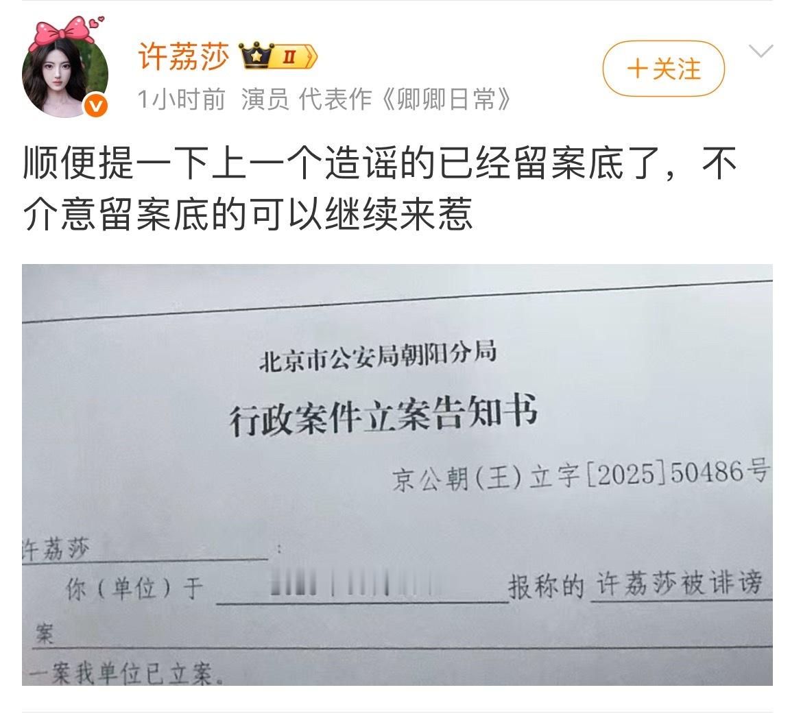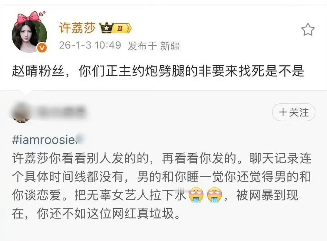 许荔莎说上一个造谣的已经留案底了,到底谁又惹她了?点名了赵晴粉丝!(虽然这是行政案件)