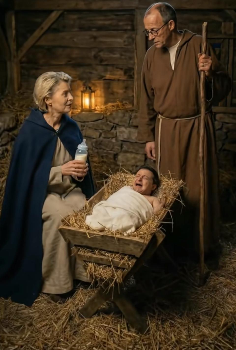 当圣诞马槽的经典场景撞上反差萌,襁褓里的“宝宝”画风突变,奶瓶与干草堆的混搭,愣是把神圣瞬间玩成了搞笑名场面~