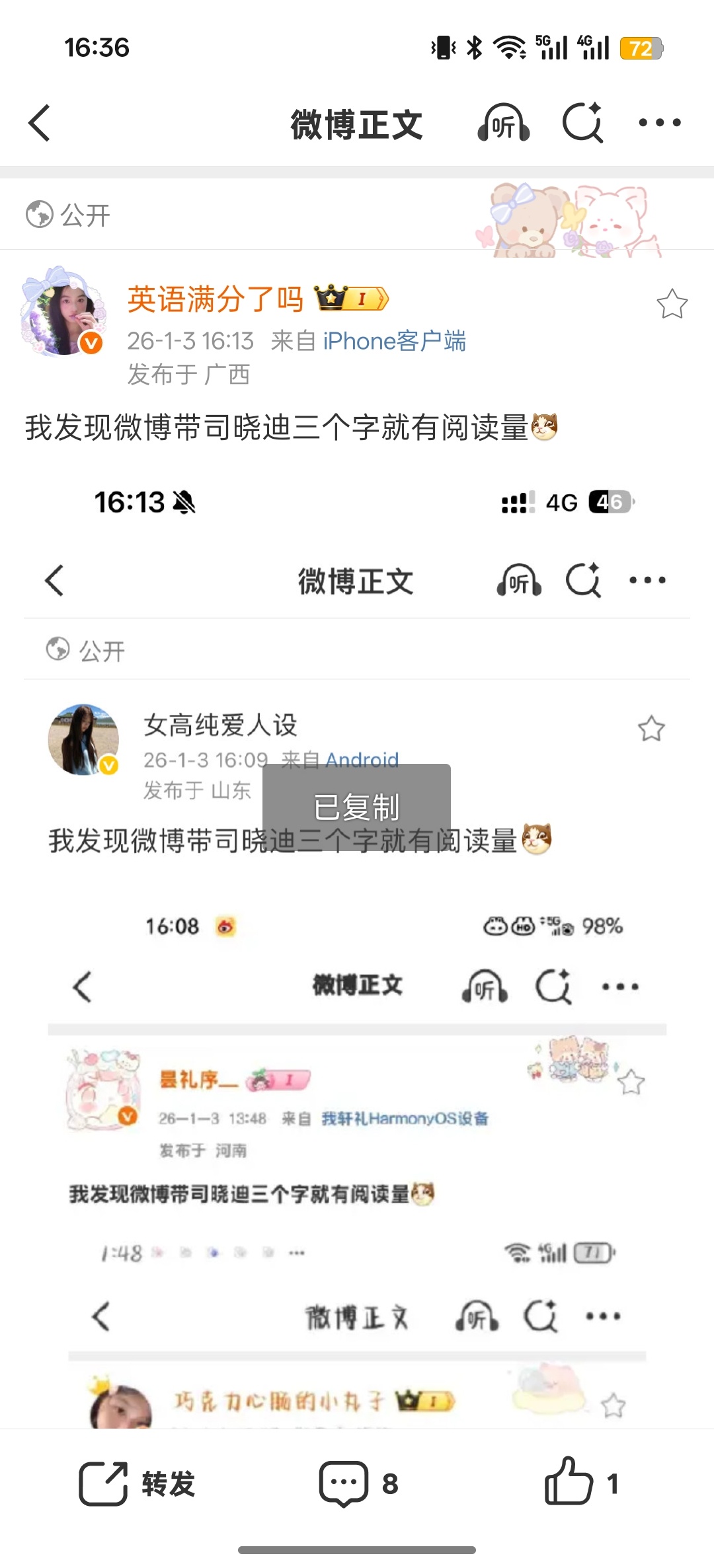 我发现微博带司晓迪三个字就有阅读量