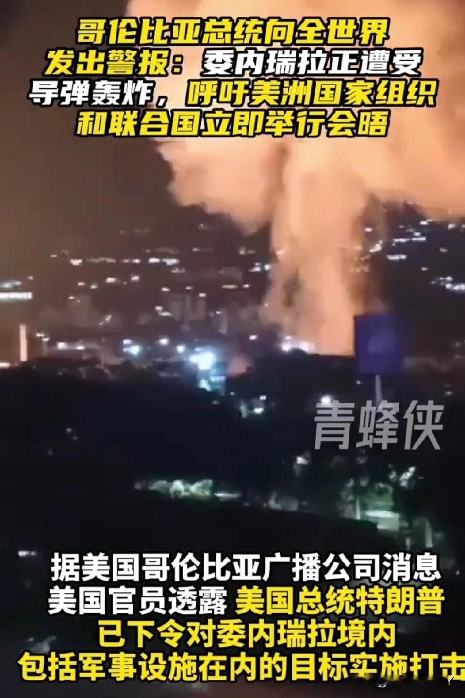 美总统下令空袭委内瑞拉 据路透社等报道,当地时间1月3日凌晨,委内瑞拉首都加拉加斯可不太平,接连传出多声爆炸。 美国官员证实特朗普下令对委境内,包括军事设施等地空袭。当时加拉加斯至少有七次爆炸声,还有低空飞行飞机,地面震动让目击者直呼可怕。 爆炸还以蒂乌纳堡为目标,该市南部靠近军事基地区域都断电了。 哥伦比亚总统称委“正遭受攻击”,呼吁美洲国家组织和联合国开会。 委政府指控美国攻击民用及军事设施,拒绝谴责这种军事侵略。委政府觉得美国是想夺石油和矿产资源,但强调美国“不会成功”。因为“持续军事活动”,美国商业航班还被委禁飞,委政府也号召支持者上街示威。 这局势真是紧张啊! 委内瑞拉战局