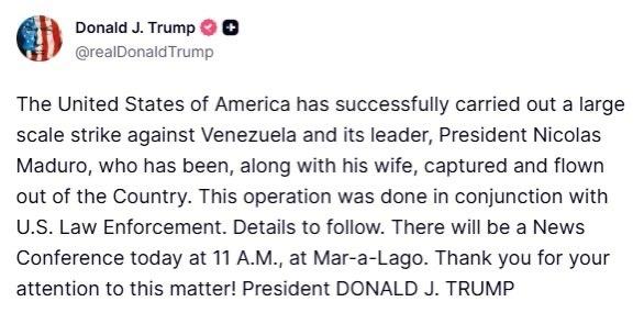 综合纽约时报、CBS等媒体消息,马杜罗及其妻子应该确实是被抓了。参与抓捕行动的是,美军三角洲特种部队,抓捕行动中美军无人员伤亡。特朗普将会在美国时间上午11点举办新闻发布会,公布抓捕行动的详情。 个人觉得,美军的这次行动仍有很多的疑点,马杜罗绝对不是坐以待毙的人,他注册了420万的民兵要与美国拼到底,不可能如此轻易的就被抓了。他辛苦布局了这么多年,不可能连一个护卫都没有,美军如果强行对其进行抓捕,势必会与其护卫交上火,不可能无人员伤亡。要我看,要么他是自愿被抓捕的,要么就是出了内鬼,卸下了他的武装。