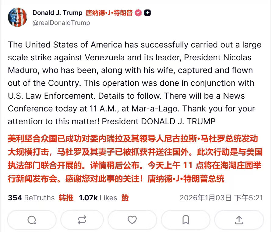 特朗普宣布抓获了马杜罗并送往国外,这次行动是与美国执法部门联合开展的。