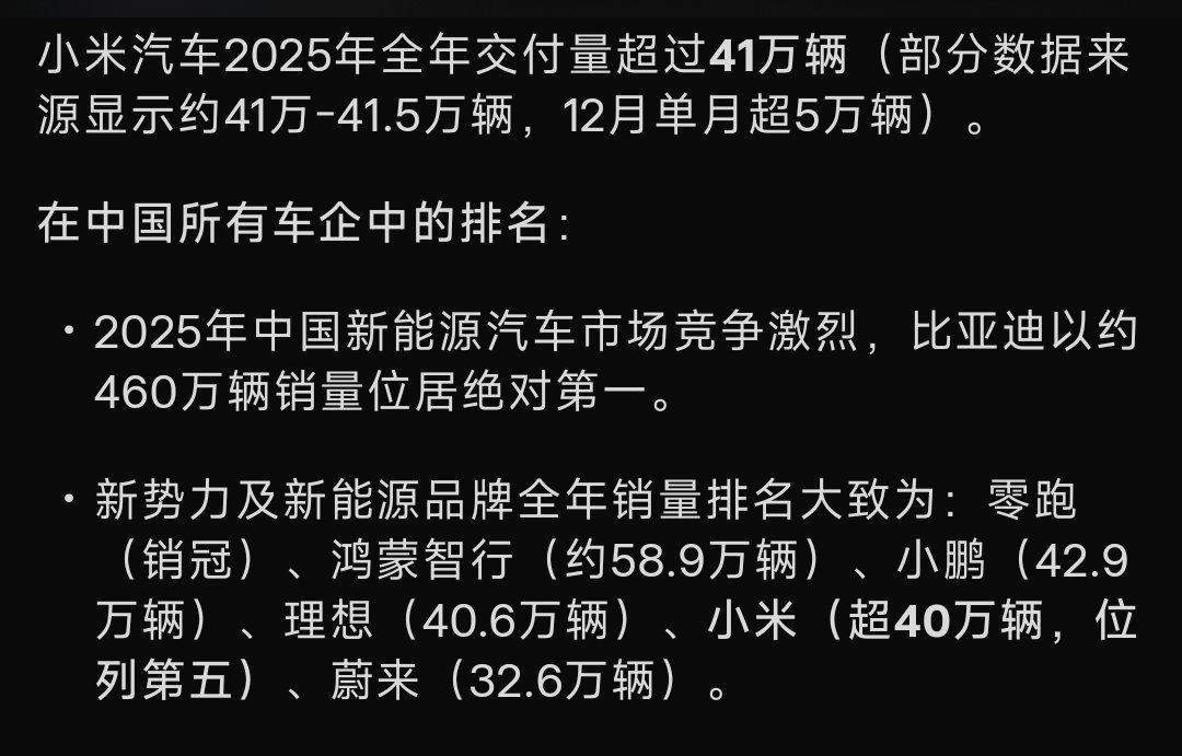 小米汽车25年交付超过41万25年交付41万辆,这个数据在新势力品牌中排第5,作