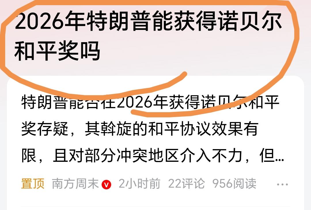 特朗普2026诺贝尔和平奖泡汤了?因为美国对委内瑞拉不宣而战,打响侵略战争第一枪。 如果还有人这么看这个问题就说明他还没有理解诺贝尔和平奖是什么东西。 这个和平奖是给那些积极维护西方价值观意识形态或者从其他意识形态价值观转投西方价值观意识形态的人的奖赏。与他是否为世界和平作出贡献无关,只要满足核心要求,他发动战争,引发战争,其实都无所谓。 税宗之所以得不到,根本原因就在于他的价值观和曾经的建制派不一样,哪怕他前一任期没有出过一次兵,他也得不到。奥黑观海,出兵打仗照样得奖。 税宗要想获得诺贝尔和平奖,他只要做一件事情,马上就可以获得。 那就是只要他坚定支持LGBTQ,支持毒品合法化,改变移民政策。 不用他去求,诺贝尔和平奖早就给他了,还会有一篇他转载10次都意犹未尽的赞美颁奖词。 抓委内瑞拉总统,炸死委内瑞拉人,这些在诺贝尔和平奖那里都不重要。 点右上角关注我,我们一起去看这个魔幻的世界