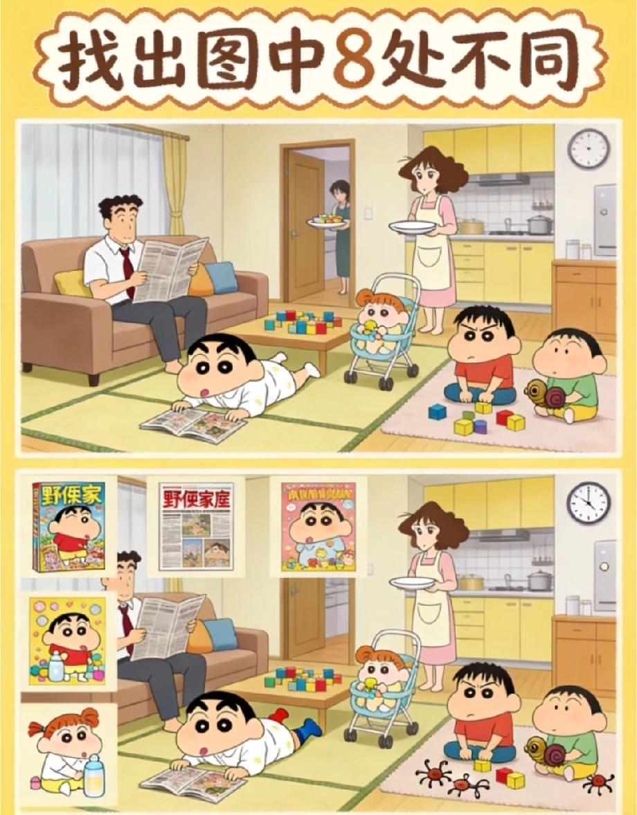 挑战眼力!蜡笔小新居家篇找不同,8处不同你发现了几个?评论区晒答案!