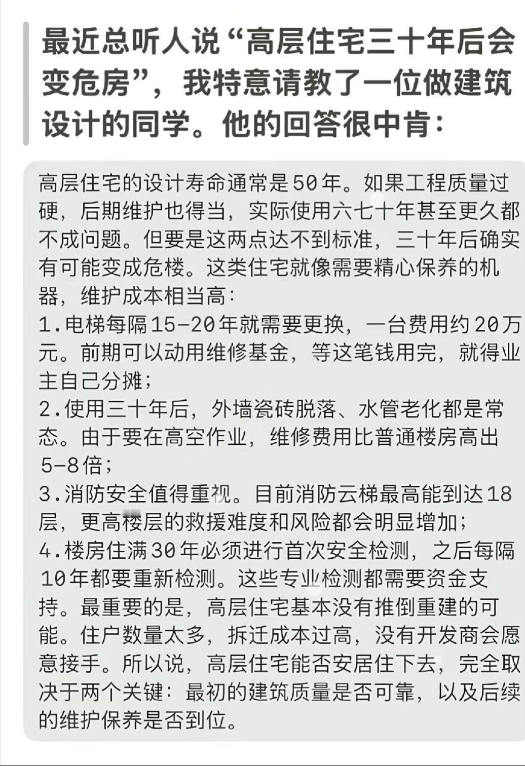 最近总听人说高层住宅三十年后会变危房,我特意请教了一位做建筑设计的同学,他的回答很中肯。