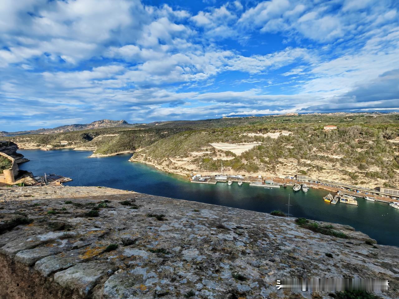 5️⃣ 韦基奥港~最美的博尼法乔 迎着晨雨🌧踏上了新的旅程,车程40分钟来到了本次环岛游最美的博尼法乔【第三大城市】,幸运的事再次发生,雨居然停了,尽管山风依然,雨后的天空分外清澈与宁静。 博尼法乔古城(Vieille ville de Bonifacio)位于科西嘉岛最南端,矗立在高而狭窄的岬角上周围堡垒遗迹遍布,受海水侵风蚀形成独特的白色岩溶风貌。 古城的历史核心是「博尼法乔城堡区」Citadelle de Bonifacio,城堡始建于1195年,经过多个世纪的加固和修缮,保留了大部分的防御工事。我们步行通过热那亚门进入城堡,这座门几个世纪以来一直是上城的唯一入口,入城的吊桥是1830年对17世纪原版的替换。 城堡的城墙可以俯瞰地中海和白色悬崖,建筑多为中世纪风格,狭窄的街道让开车的人高度紧张,古老的房屋充满历史韵味。站在古城能眺望到【阿拉贡国王楼梯】,它们是一段刻在悬崖上的187级古老台阶,传说由阿拉贡国王阿方索五世下令修建,沿着楼梯下行可以欣赏到壮观的海景。