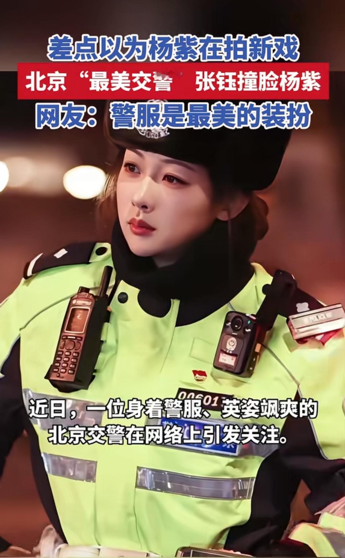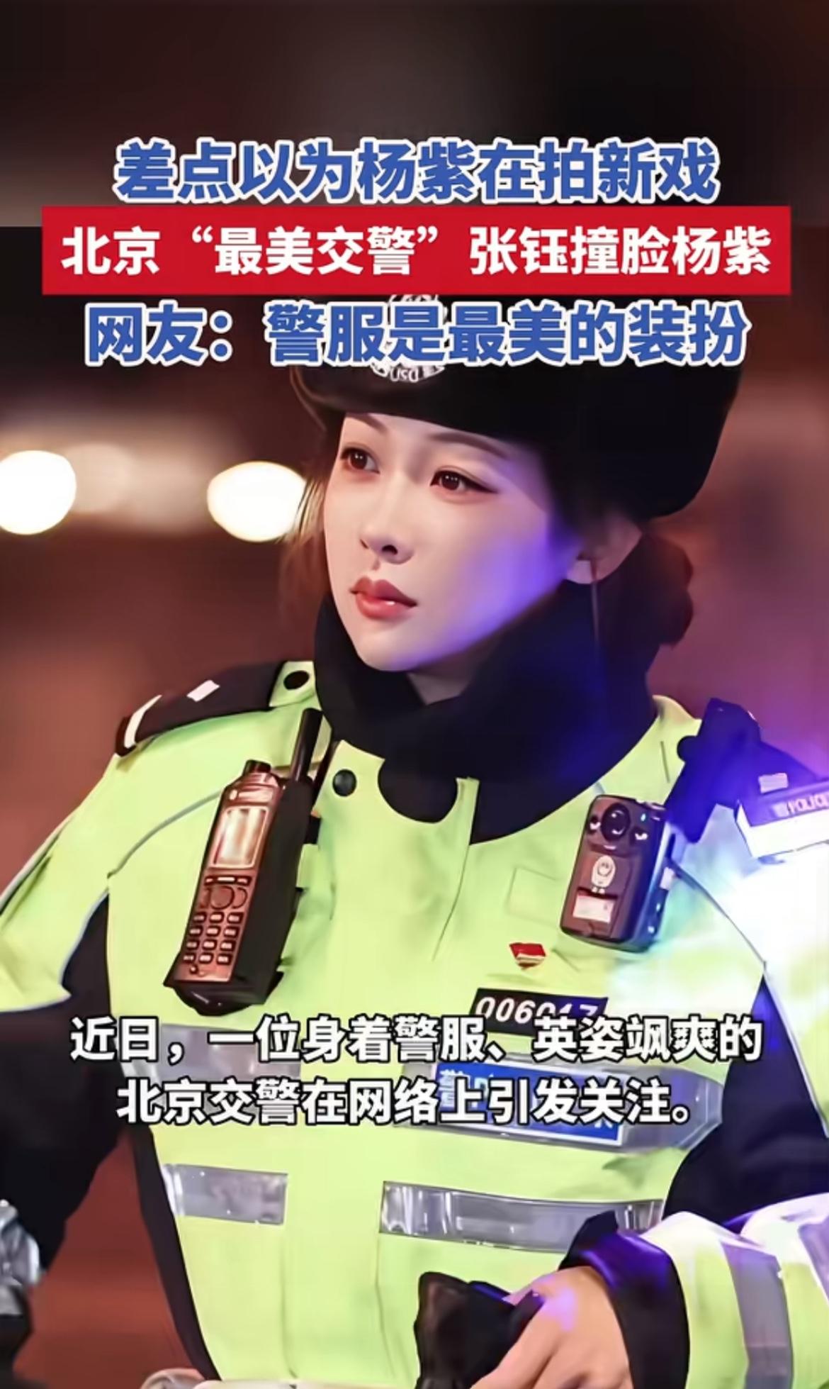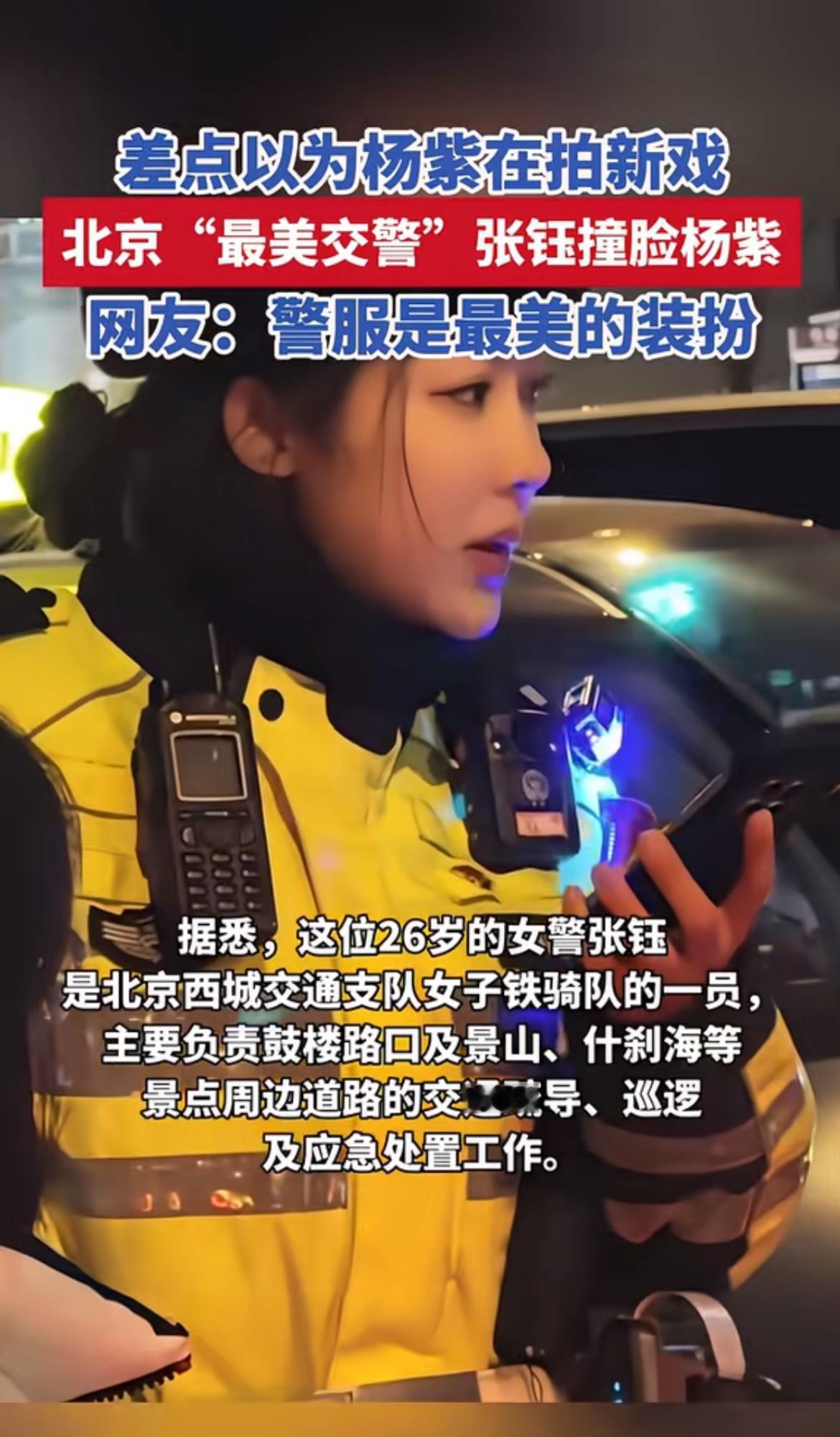 最近北京“最美交警”张钰火出圈啦!她才28岁,执勤时被网友喊成杨紫。瞧她跨在600斤大铁骑上,一挥手,车流就乖乖排队,手套雪白,脸蛋被太阳照得红扑扑,和杨紫小时候真有几分神似。网友把她和杨紫新剧穿制服的图一拼,来了个“真假女警大对撞”,特别逗。 有粉丝专门从新疆飞过来打卡,她还笑着提醒别挡道。跨年夜别人在家吃饺子,她还在长安街巡逻。所里想给她调岗,她都拒绝了。她很清醒,说关注是责任,这光属于所有一线交警。这样的交警谁能不爱呢?