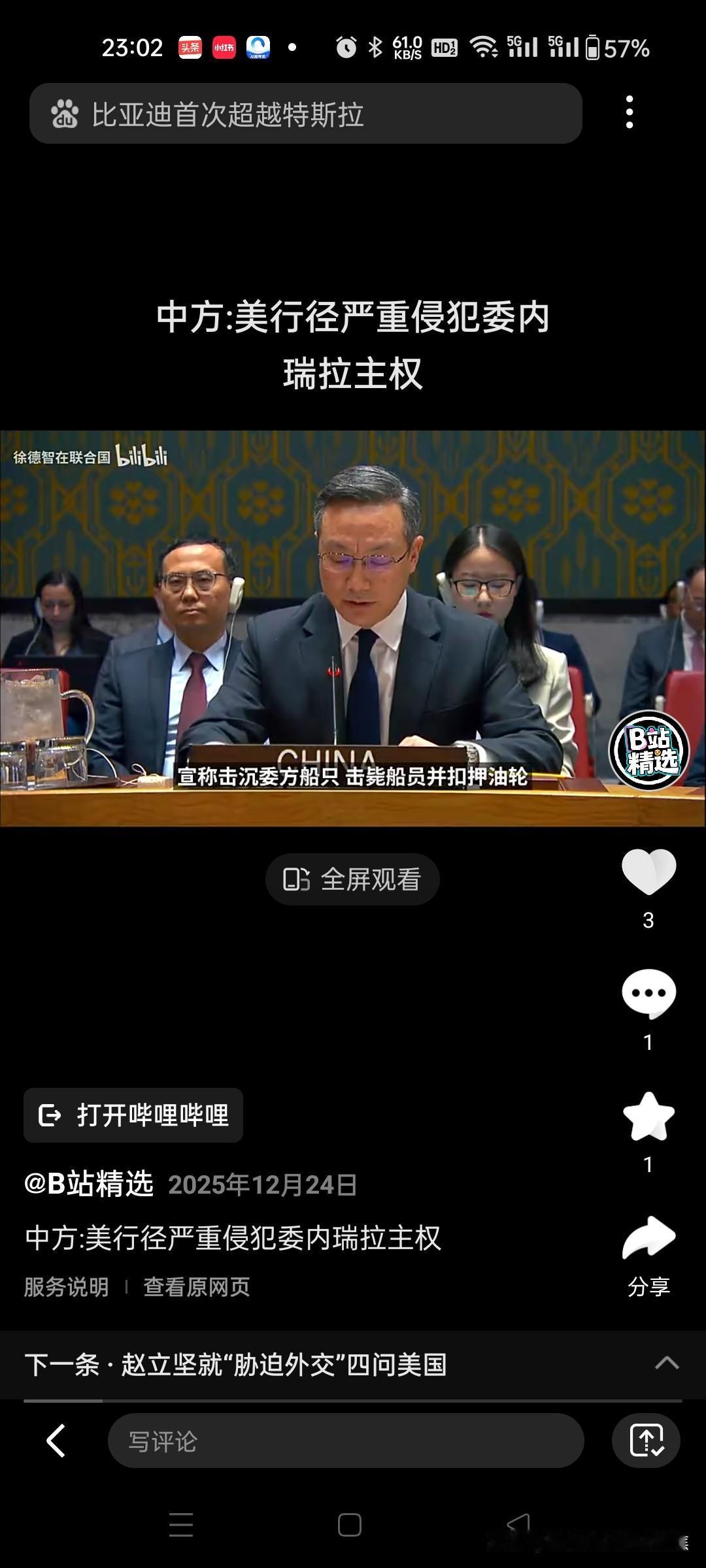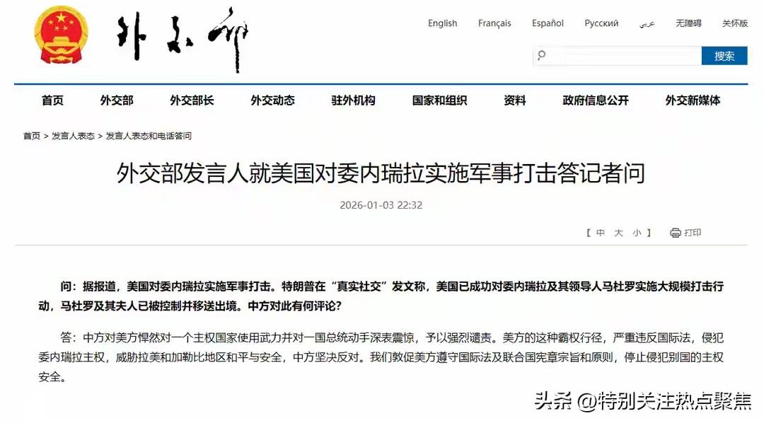 中国外交部就美国军事打击委内瑞拉事件发表声明中方对美方悍然对一个主权国家使用武力并对一国总统动手深表震惊,予以强烈谴责。美方的这种霸权行径,严重违反国际法,侵犯委内瑞拉主权,威胁拉美和加勒比地区和平与安全,中方坚决反对。我们敦促美方遵守国际法及联合国宪章宗旨和原则,停止侵犯别国的主权安全。 中方对美方悍然对委内瑞拉使用武力并控制其总统表示震惊和强烈谴责,反对这一严重违反国际法的霸权行径,敦促美方立即停止侵犯主权。 中方官方回应详情 中国外交部于2026年1月3日就美国军事打击委内瑞拉事件发表声明,核心内容包括: 定性美方行为:中方将此次行动定义为霸权行径,认为其严重违反《联合国宪章》和国际法,侵犯委内瑞拉主权,并威胁拉美及加勒比地区和平稳定。12 中方立场: 强调主权不可侵犯原则,反对任何国家以武力干涉他国内政。 要求美方遵守国际法义务,立即停止军事行动。23 外交行动:中方表示将与国际社会协作,推动通过对话解决争端,维护地区安全。3 事件背景与中方关切 美方行动细节:2026年1月3日,美国对委内瑞拉实施军事打击,控制总统马杜罗及其夫人,并宣称将其移送出境。此举基于美国单方面指控,未获联合国授权。3 中方核心关切: 主权原则:中国一贯主张各国主权平等,反对武力干预内政,此次事件直接挑战国际秩序基础。23 地区稳定:委内瑞拉局势升级可能引发拉美连锁反应,中方呼吁避免冲突扩散。3 以下是关于美方行动背景的视频:  01:52 中方后续立场与呼吁 反制措施:中方未明确提及具体制裁,但强调将采取一切必要措施捍卫国际法权威,包括在联合国框架内推动问责。34 国际协作:敦促联合国安理会介入,要求美方接受国际监督,并支持通过多边机制解决争端。23 长期立场:重申和平解决争端原则,反对单边主义,强调中国愿与各国合作维护全球安全。35