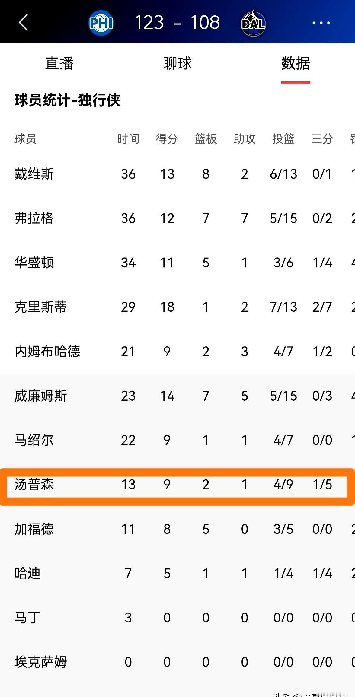 克莱的三分一旦投不进,他在场上就真的没用了? 就说打76人这场,独行侠主场108比123输了。汤普森替补13分钟,三分球5投只有1中,正负值-12,全场就9分。这数据,确实有点。扎心。 这不是偶然。他这赛季三分命中率掉到35.4%,远低于生涯水准。独行侠指望他来当外线炮台,结果他手感一凉,球队进攻直接断电。 球队战绩12胜23负,在西部垫底挣扎。管理层当初签下35岁的汤普森,这笔买卖买卖,现在看来风险暴露了。 甚至有数据显示,他不在场时,球队配合反而更流畅。有人就嘀咕,战术是不是太依赖一个手感不稳的老将了? 对面76人多点开花,马克西34分带队打爆独行侠。 汤普森的角色再不调整,独行侠这个赛季就悬了。大家觉得他该打首发还是替补?