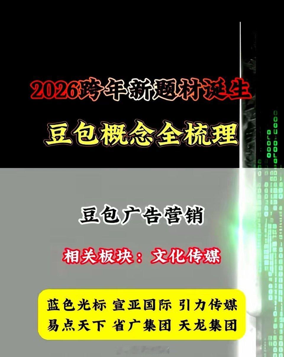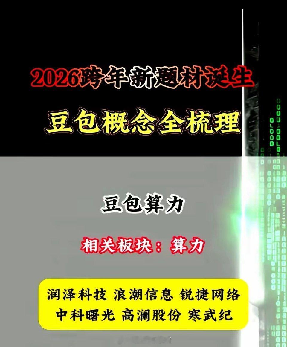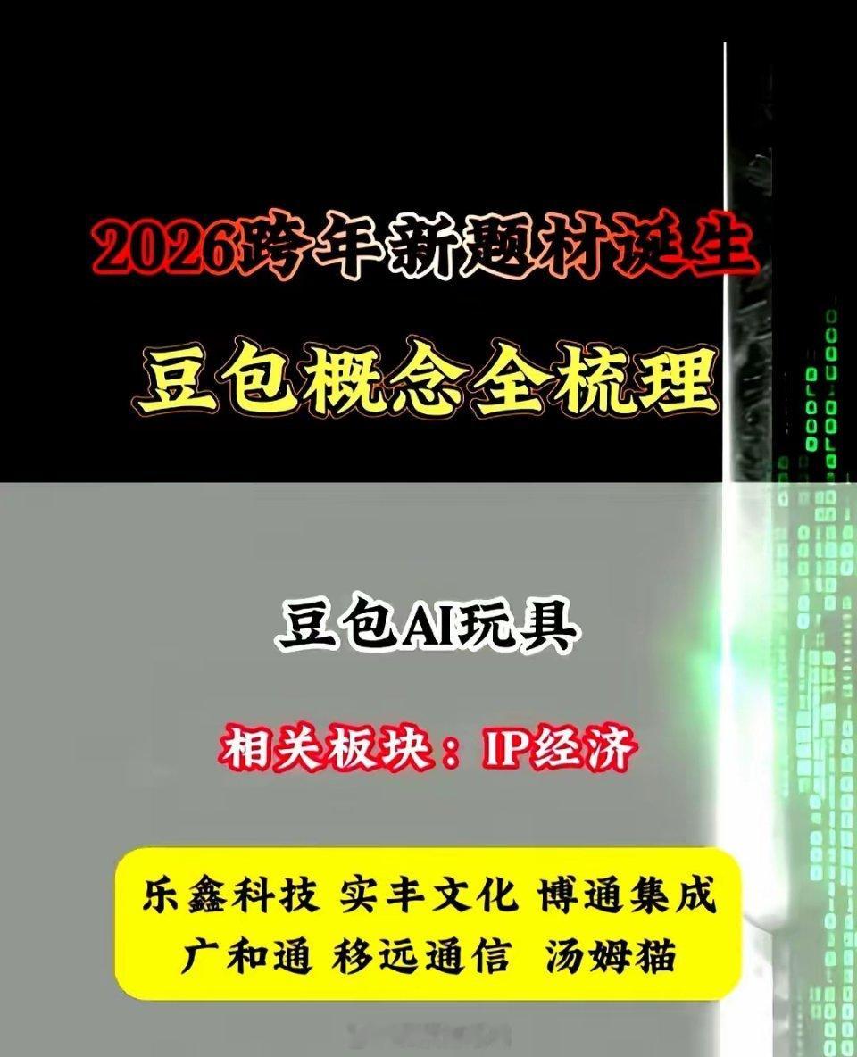 2026年全新题材诞生!豆包5大领域相关产业链龙头名单:(仅供参考,不做投资依据)豆包概念之一:以海天瑞声、掌阅科技、视觉中国、中文在线、润泽科技、亚康股份为代表的豆包数据中心领域。豆包概念之二:以乐鑫科技、实丰文化、博通集成、广和通、移远通信、汤姆猫为代表的豆包AI玩具领域。豆包概念之三:以蓝色光标、宣亚国际、尹力传媒、易点天下、省广集团、天龙集团为代表的豆包广告营销领域。豆包概念之四:以中科蓝讯、中科创达、佳禾智能、歌尔股份为代表的豆包耳机领域。豆包概念之五:以润泽科技、浪潮信息、锐捷网络、中科曙光、高澜股份、寒武纪为代表的豆包算力领域。