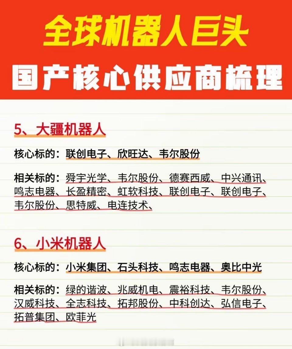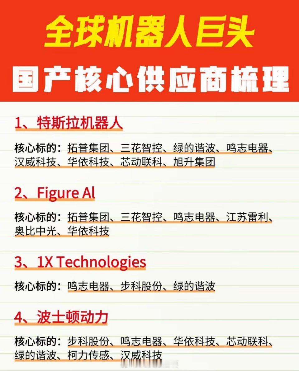 当下机器人领域超火,政策、资本、技术三线发力,A股相关板块热度爆棚。在全球机器人发展浪潮下,A股有不少核心公司值得关注。像绿的谐波,作为谐波减速器龙头,是国产替代标杆。人形机器人大量使用其谐波减速器,一台特斯拉Optimus要用14个,单价1200元,毛利率达50%。汇川技术是工控自动化龙头,提供“伺服系统 + 控制器”核心解决方案,在机器人领域扩张迅速。还有三花智控把汽车冷媒阀改成机器人旋转执行器,2023年机器人条线收入20亿。不过投资还得基于自身研究,不能盲目跟风。