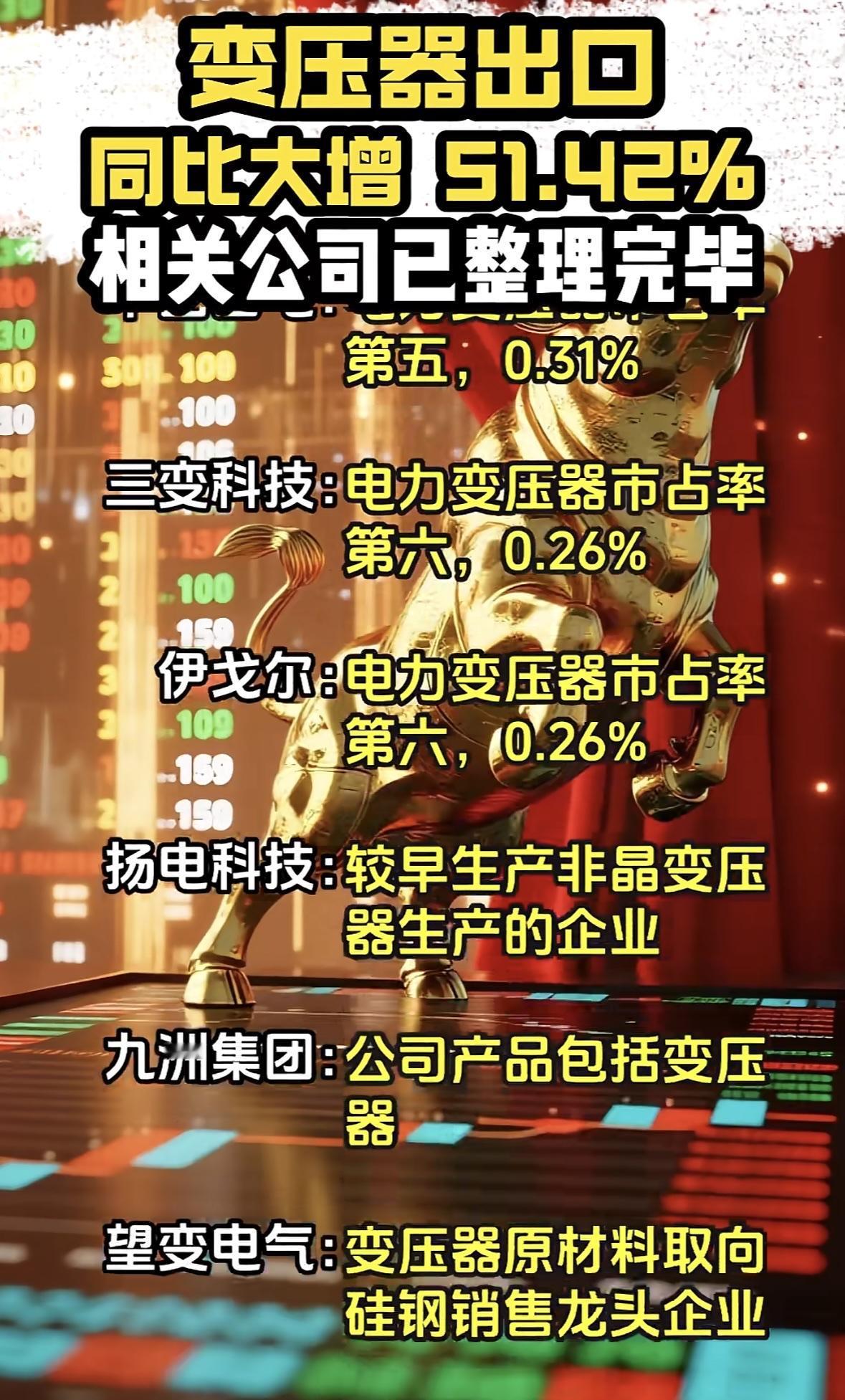 变压器出口大增51.42%,相关公司整理完毕! 变压器市场火爆,龙头特变电工领跑, 许继、保变等紧随其后,行业竞争格局明朗。