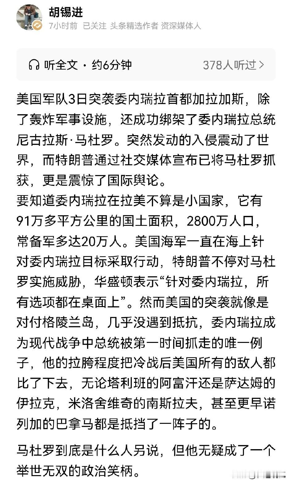 胡锡进:马杜罗的结果此前已有先例。 当年美国对巴拿马前领导人诺列加的指控罪名也是贩毒,可以说和对马杜罗的指控是一样的,美国在1989年入侵巴拿马,诺列加被捕,最终被关押了21年才引渡回国。 这一次委内瑞拉总统马杜罗大概也会和诺列加差不多的审判结果,如果这样的话,那么后半生可能就没有自由了。