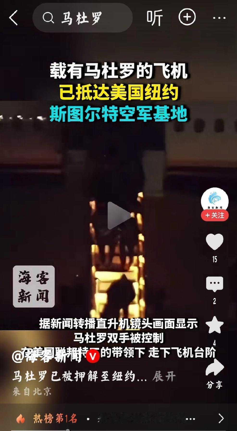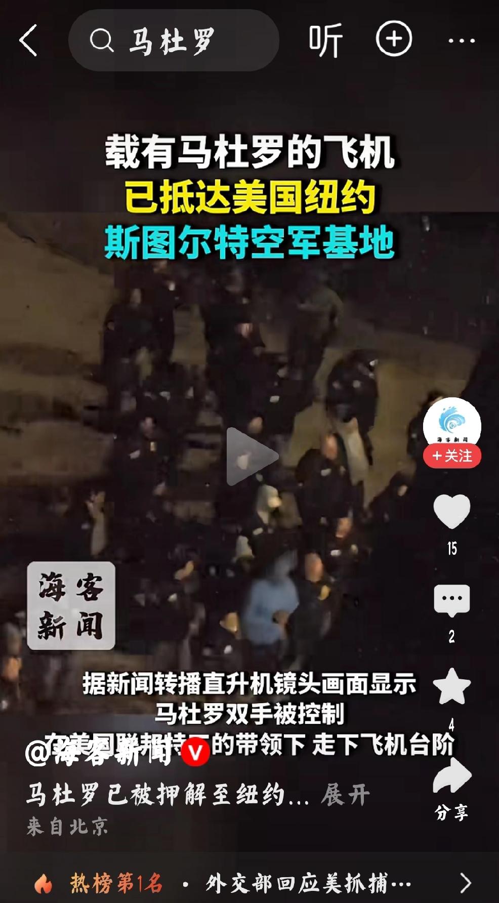 此刻是马杜罗,下一个是谁? 个人观点,海客新闻的视频看到了马杜罗一个不能分辨模糊的身影。 个人心中感慨万千,现在是马杜罗,那么在不远的将来,又将是哪个国家的领导人被扣押走下飞机? 会是反对美国强占巴拿马运河的巴拿马总统吗? 会是反对美国强占格陵兰岛的丹麦领导人吗? 任何没有获得美国认可的国家,都有几率成为美国侵略的对象。
