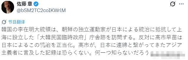 “高市早苗最惧怕的,不是李在明访华,而是他要去参观‘大韩民国临时政府旧址’!”这句话,是日本著名时政评论员、《朝日新闻》前记者佐藤章在1月3日警告日本的话。 根据青瓦台发布的消息,韩国总统李在明1月4日抵达北京,1月6日会前往上海停留两天,核心行程之一就是参观那处位于上海黄浦区马当路的大韩民国临时政府旧址。 这地方在别人眼里可能只是一栋普通的石库门小楼,但在韩国人心里分量重得很,说是“民族独立圣地”都不为过,历届韩国总统访华,几乎都会专程往这儿跑。 毕竟这里藏着韩国人亡国后的抗争史,1910年《日韩合并条约》签订后,朝鲜半岛彻底沦为日本殖民地,1919年“三一独立运动”被镇压后,幸存的独立志士走投无路,就是在上海的租界里秘密成立了临时政府,在这儿缝国旗、定宪章,还策划了不少抗日义举。 1932年尹奉吉在上海虹口公园炸伤日本军政高官的壮举,就源自这个临时政府的部署,而这栋小楼也成了中韩并肩抗日的见证。 1948年大韩民国成立时,宪法里明确写着继承这个临时政府的法统,1919年也被定为韩国开国元年,这处旧址说白了就是韩国“建国根基”的象征。 李在明选在访华期间去这儿,明眼人都能看出门道,尤其是对高市早苗这种右翼强硬派来说,这可比单纯的外交访问扎心多了。 要知道高市早苗2025年10月上台后,日本政治右倾化的步子迈得飞快,她本人就是出了名的历史修正主义者,多次参拜靖国神社,还否定“村山谈话”,连历史教科书里关于“慰安妇”、南京大屠杀的记述都要质疑。 她内阁里的人也清一色是保守派,防卫大臣小泉进次郎常去靖国神社,经济安全担当大臣还总发表排外言论,甚至有人公开扬言日本应该拥有核武器。 在这种背景下,李在明去参观纪念抗日独立运动的旧址,无异于当众给高市早苗的历史观打脸——你想淡化殖民历史,我偏要把这段屈辱又热血的过往摆到台面上,还要让全世界看到。 更让高市早苗坐不住的是,李在明这步棋选得时机太巧了。之前高市早苗政府在独岛问题上频频挑衅,直言不讳地主张日本对独岛的主权,逼得韩国总统室直接表态要“严肃回应”。 原本日韩还计划在奈良举行首脑会谈,讨论半岛无核化和三边合作,这是高市早苗想稳固地缘政治的重要契机,结果李在明转头就敲定访华行程,还把参观旧址这一敏感环节加了进去,相当于明着告诉高市早苗:你不尊重历史,我就找能共情历史的伙伴站在一起。 而且现在日本的处境也不允许它在历史问题上闹太僵,2026财年日本防务预算已经突破9万亿日元,成了中美之外第三大军事开支占GDP比重的国家,还在琢磨修改“无核三原则”、松绑武器出口,本来就已经让周边国家警惕,要是再因为历史问题和韩国彻底闹掰,只会让日本在半岛问题上更加被动。 李在明这么做,也符合他一贯的政治风格。之前尹锡悦政府亲近日本的时候,李在明就靠着反日立场积累声望,日本排放核污水时,他还带头绝食抗议,甚至因此遭遇过刺杀,这些经历让他在韩国民间积累了不少支持。 现在高市早苗的右翼路线越走越极端,李在明通过参观旧址强化反日立场,既能巩固国内支持,又能借着中韩合作的势头给日本施压,可谓一举两得。 而对高市早苗来说,她最怕的就是这种历史议题被放大,一旦李在明在旧址发表相关表态,不仅会让日本国内的历史反思声音抬头,还会让国际社会再次聚焦日本的殖民历史,打乱她推动右倾化的节奏。 说到底,这不是简单的参观行程,而是一场历史立场的较量。高市早苗越是想淡化殖民历史、推动军国主义抬头,就越怕别人把这段历史摆出来。李在明访华谈经济合作是务实之举,但参观大韩民国临时政府旧址这一步,才是真正戳中了高市早苗的软肋。 佐藤章的警告没说错,对现在的高市早苗来说,比起李在明和中国谈成多少合作,这处旧址带来的历史拷问,才是最让她坐立难安的。