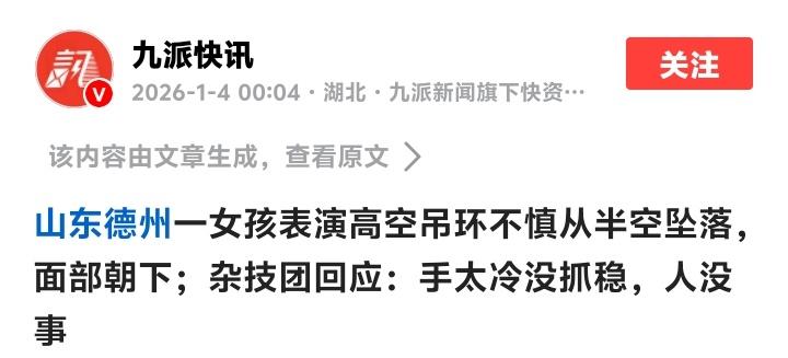 零下十度高空坠落!山东德州街头惊魂一幕,杂技女孩手冻僵失手背后,是民间艺人生存之痛 寒风刺骨的山东德州街头,一场民间杂技表演正在上演。观众们裹紧棉衣,抬头望向空中那个纤细的身影。音乐声中,女孩腾空而起,吊环在空中划出弧线。然而不到二十秒,意外发生——她突然从数米高空直直坠落,面部朝下重重摔在冰冷的地面上。那一刻,时间仿佛凝固,惊呼声划破冬日的沉闷。 视频迅速在网络传开。画面里,女孩被同伴扶起时,左脸已明显红肿,一只胳膊无力地耷拉着。可她竟没有哭闹,只是默默披上外套,站在场边继续看同伴表演。那双眼睛望着空中晃动的吊环,不知道在想什么。零下十度的天气里,她单薄的表演服和冻得通红的双手,刺痛了每个观看者的心。 杂技团很快给出解释:“手太冷没抓稳,人没事。”轻描淡写的七个字,却让人心里发沉。拍摄视频的梁先生却提出不同看法——他注意到绳索在绞盘外卡住了。是设备隐患,还是真的只因天冷?当两种说法同时出现,我们突然意识到,真相或许比看到的更复杂。 这个来自河北沧州的“黑豹舞狮团”,在抖音上展示着精彩的高跷、舞狮视频。账号里充满热闹的喝彩声,却从未拍下后台的艰辛。他们辗转于各个城乡庙会,一场演出收入或许不过千元,却要承担高空表演的全部风险。没有恒温剧场,没有保险绳,有的只是日复一日用身体挑战重力的勇气。 女孩站起来后那只不动的手臂,真的“无碍”吗?我们不得而知。只知道她很快又站回场边,像什么都没发生。这种近乎麻木的坚韧,恰恰折射出民间艺人生存的常态——摔倒了必须立刻爬起来,因为演出还要继续,因为下一顿饭还得靠今天的表演。 当我们为屏幕里的惊险瞬间惊呼时,可曾想过这些走江湖的艺人过着怎样的生活?他们可能是谁的女儿,谁的姐妹,在本该被呵护的年纪,却已经在为生计搏命。每一次腾空,都是与命运的赌博;每一次落地,都是侥幸的平安。 民间杂技传承千年,本是中华文化的瑰宝。但当它沦为街头讨生活的手段,安全便成了最先被牺牲的代价。观众扔下的打赏钱,是否值得用生命去换取?这场坠落事故像一面镜子,照出了非遗传承背后的艰难现实——那些飞檐走壁的精彩,有多少是建立在薄冰之上的舞蹈? 冬天终会过去,春天来临之时,这个女孩还会继续爬上吊环吗?我们无法替她回答。但至少,这次全网关注的坠落,应该让我们记住些什么:记住那些在寒风中赤手空拳追梦的人,记住精彩表演背后真实的人生。 下次路过街头表演时,或许我们可以多停留一会儿,给予掌声的同时也给予关切。因为每一个腾空的身影,都是活生生的人,都值得在安全网中飞翔。传统技艺需要传承,但比传承更重要的,是每个传承者都能平安落地。 (来源:根据南昌晚报、九派快讯等媒体报道综合整理) 杂技女孩坠落 民间艺人生存