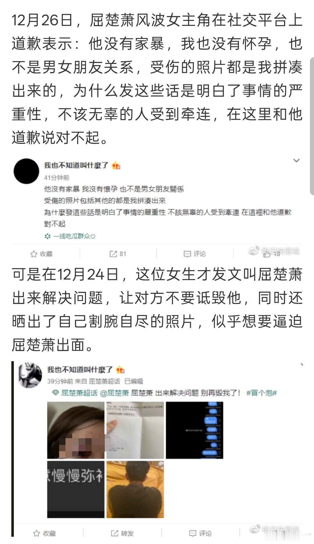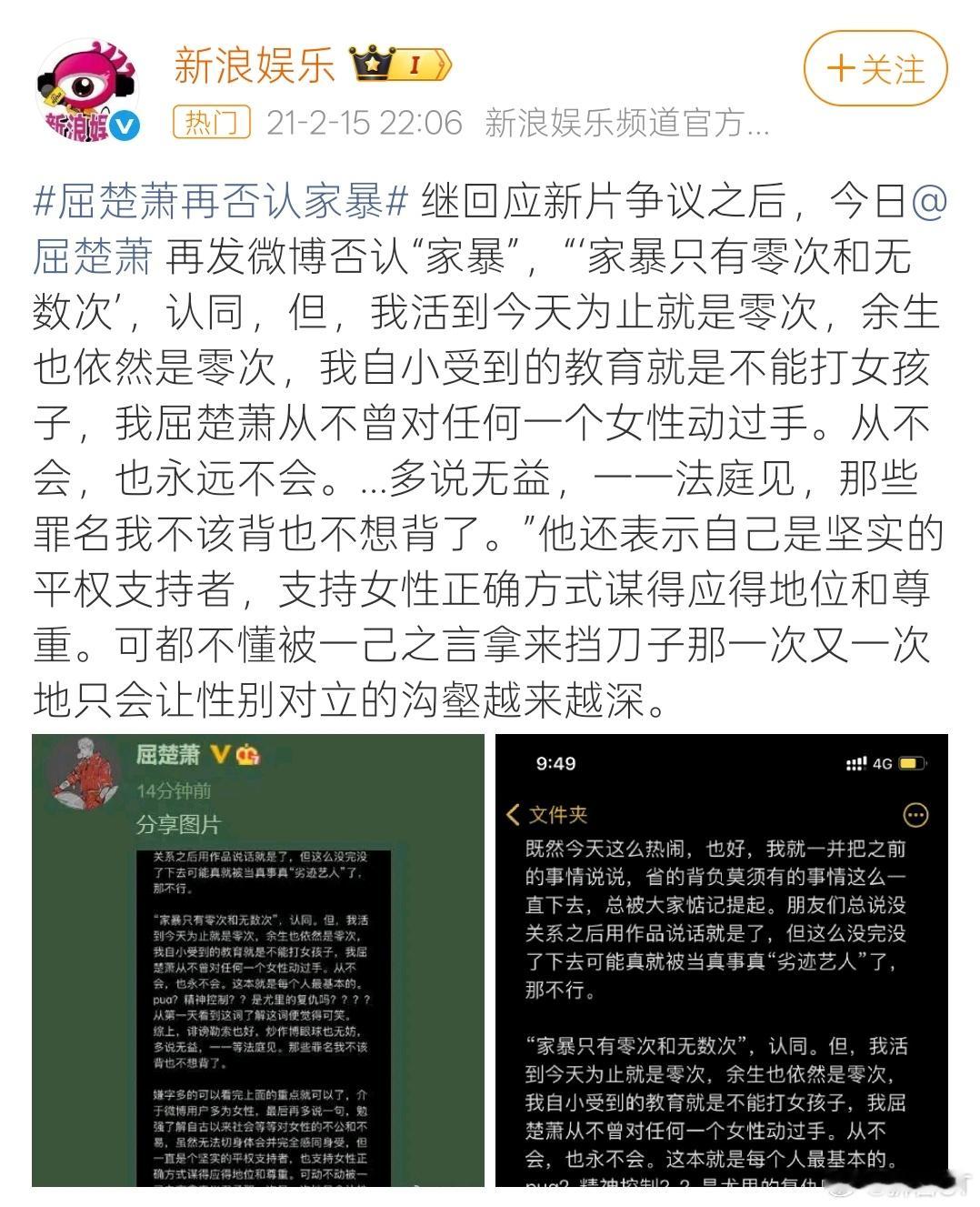 屈楚萧方公开胜诉判决书1月4日深夜,屈楚萧工作室在微博上披露判决书,再度否认家暴传闻。判决书载明,何某某在庭审中承认,其在发布微博时并未怀孕,屈楚萧亦未对其进行暴力殴打行为。据悉,屈楚萧曾于2022年就家暴事件做出再回应。其表示,他认同家暴只有0次和无数次,但他活到今天就是0次,余生也是0次。更早前,何某某亦曾回应称,“他没有家暴,我也没有怀孕,也不是男女朋友关系,受伤的图片的都是我拼凑出来的”。