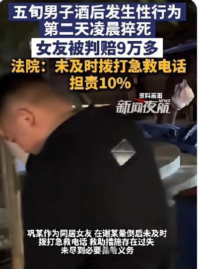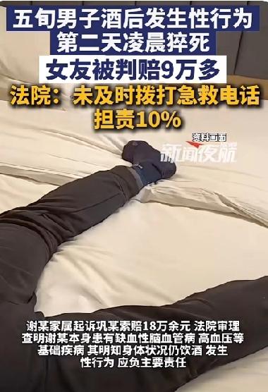 五旬男子酒后与女友同房后却猝死了,而女友也被判赔偿9万元,这可真是风流债啊! 刚刚刷到新闻夜航的一则报道,在2025年1月12日晚,甘肃甘谷县,一名五旬男子谢某留宿在女友巩某家中,饮酒后又因身体不适自行服用了胃药,随后双方发生性关系。然而,身体的不适感并未消散,谢某卧床休息至次日凌晨1时至2时许,在卫生间突然晕倒。 巩某发现谢某晕倒后,顿时手忙脚乱,赶忙叫来邻居将谢某抬回床上,随后竟然又外出打车去寻找谢某的同事求助,直至凌晨3时18分才想起来拨打急救电话。医护人员赶到后虽全力抢救,但已错失最佳救援时机。谢某家属认为巩某未尽到救助义务,将其诉至法院,索赔18.7万余元。 据了解,谢某曾因缺血性脑血管病、高血压病2级(极高危)住院治疗,属于中风高危人群。明知自己身体不适,还执意在饮酒后发生性行为,于是法院判定巩某承担10%责任,赔偿9.3万元。巩某不服上诉,天水市中级人民法院二审驳回上诉,维持原判。 作为一个成年人,要对自己的身体健康负责,明知不可为而为之实在是不理智的行为。谢某自身有严重的基础疾病,面对美色时却没有克制自己,最终导致生命终结。量力而行不仅是一种智慧,更是对于自己以及家人的负责。酒后致死 婚外情猝死 酒醉致死 平凡岁月的感悟