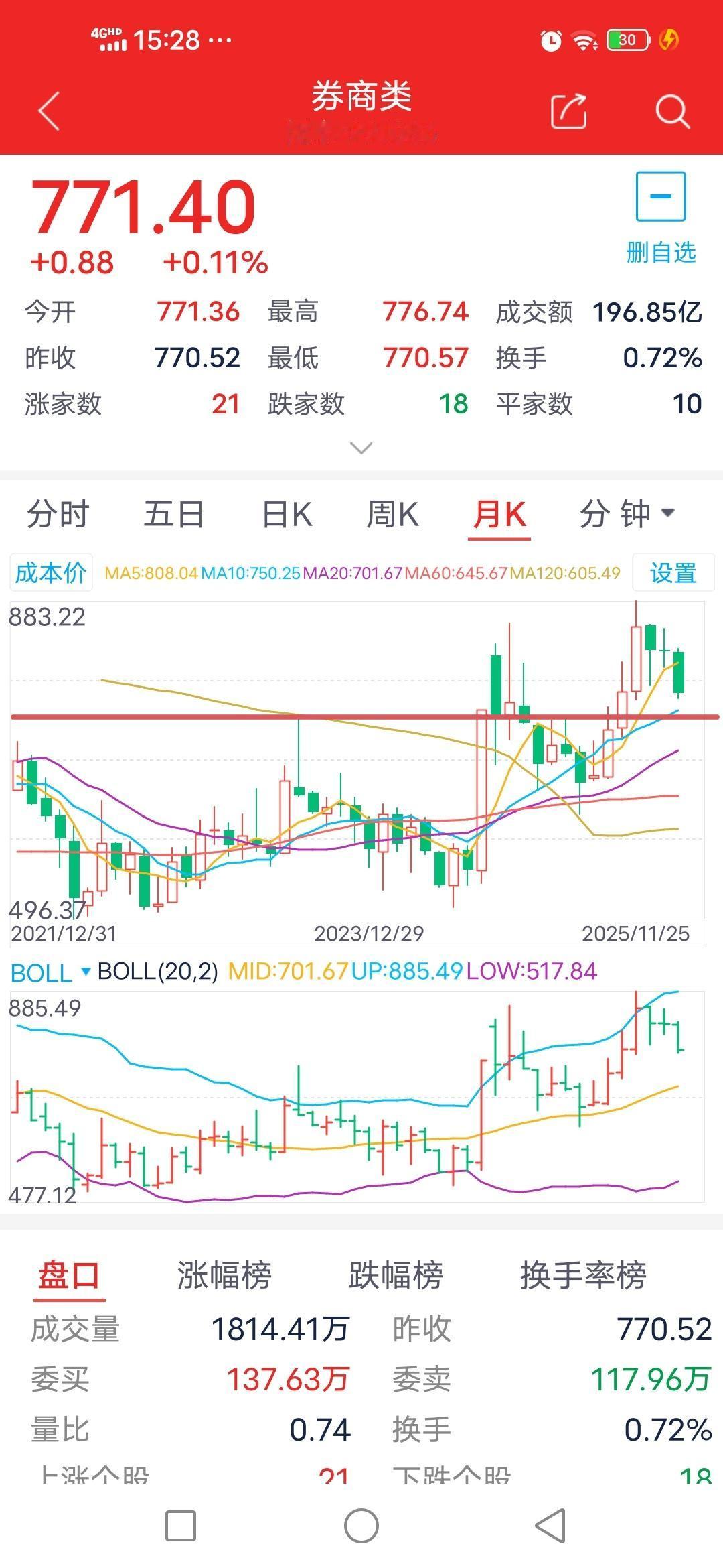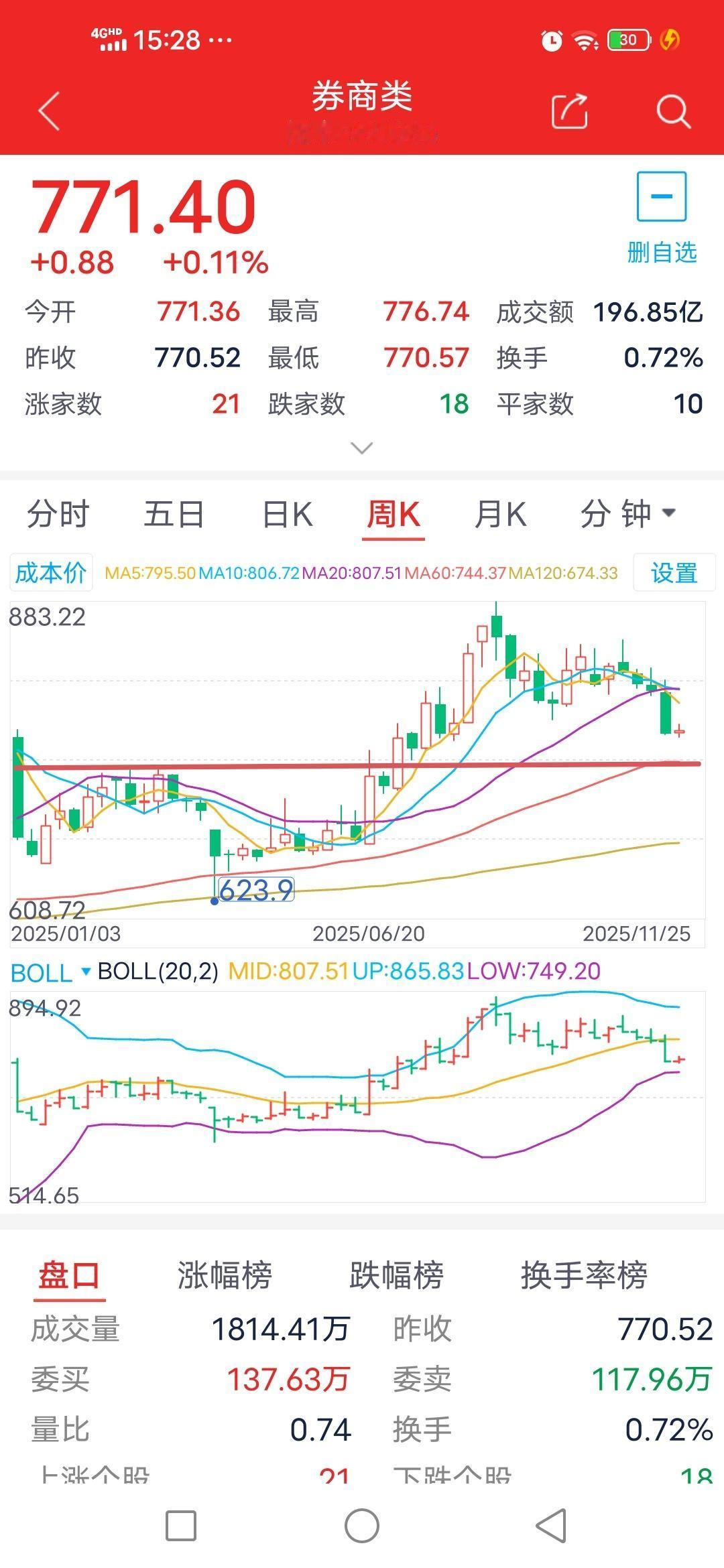 券商板块现止跌信号,11月26日走势如何? 昨日指出,因下跌势头过猛,今日或开启止跌反抽。截至今日下午收盘,券商板块未再创新低,显露出止跌迹象。 从日线级别看,今日收出十字星,且未现调整新低,可判定为暂时止跌。不过,尚不能判定调整结束,当前是在放缓下跌速度,等待5日均线下移。明日会对5日均线发起冲击,若无法突破,便有可能再度向下调整。 从周线和月线级别分析,下方的750点与740点对指数有向下的吸引作用。所以,目前判断这两个点位才可能是调整的目标位。