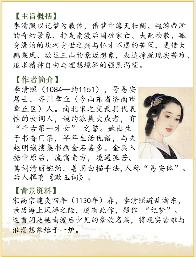 宋高宗建炎四年(1130年)春,李清照避乱浙东,亲历海上风涛之险,遂有此作,题作 “记梦”。这首词是她南渡后少见的豪放名篇,将现实苦难与浪漫想象熔于一炉。