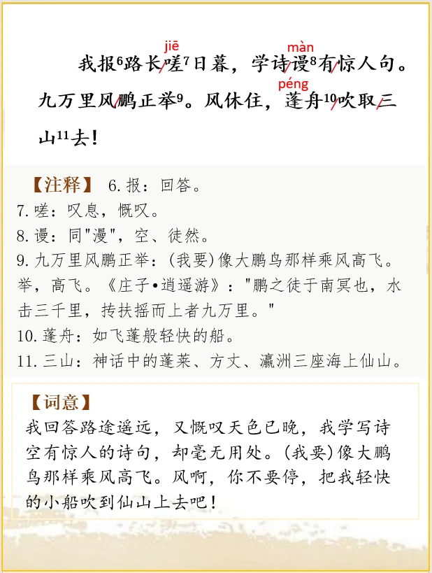 9.九万里风鹏正举:(我要)像大鹏鸟那样乘风高飞。举,高飞。