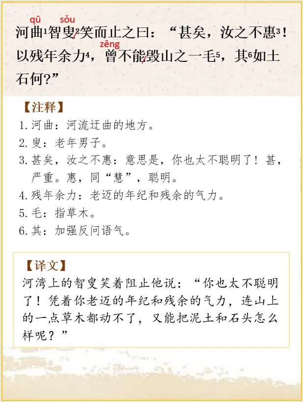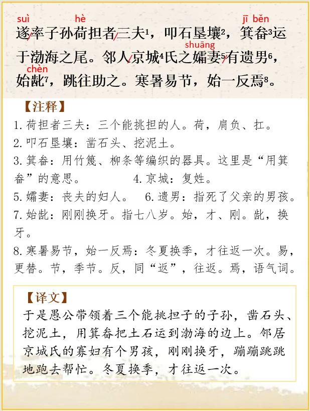 于是愚公带领着三个能挑担子的子孙,凿石头、挖泥土,用箕畚把土石运到渤海的边上。邻居京城氏的寡妇有个男孩,刚刚换牙,蹦蹦跳跳地跑去帮忙。冬夏换季,才往返一次。河湾上的智叟笑着阻止他说:“你也太不聪明了!凭着你老迈的年纪和残余的气力,连山上的一点草木都动不了,又能把泥土和石头怎么样呢?”北山愚公长叹一声说:“你的思想如此顽固,顽固到了无法通达事理的地步,连寡妇和孩子都比不上。即使我死了,还有我的儿子在呀。儿子又生孙子,孙子又生儿子;(孙子的)儿子还会有儿子,(他的)儿子还会有孙子;子子孙孙是没有穷尽的,可是这山却不会再增高了,还担心挖不平吗?”河湾上的智叟没有话来回答。