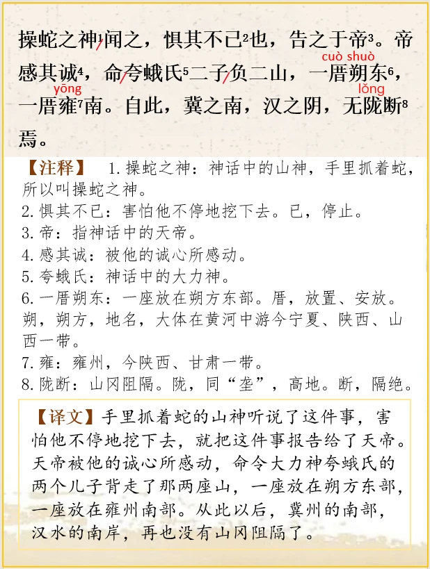 手里抓着蛇的山神听说了这件事,害怕他不停地挖下去,就把这件事报告给了天帝。天帝被他的诚心所感动,命令大力神夸蛾氏的两个儿子背走了那两座山,一座放在朔方东部,一座放在雍州南部。从此以后,冀州的南部,汉水的南岸,再也没有山冈阻隔了。
