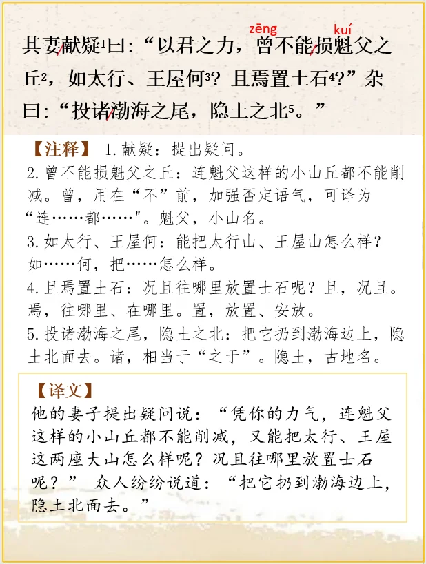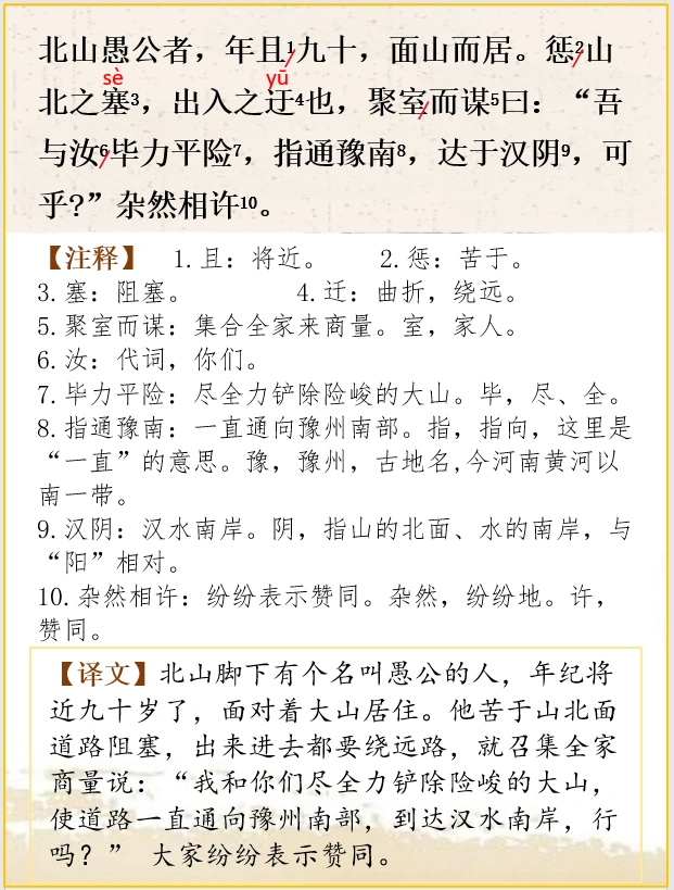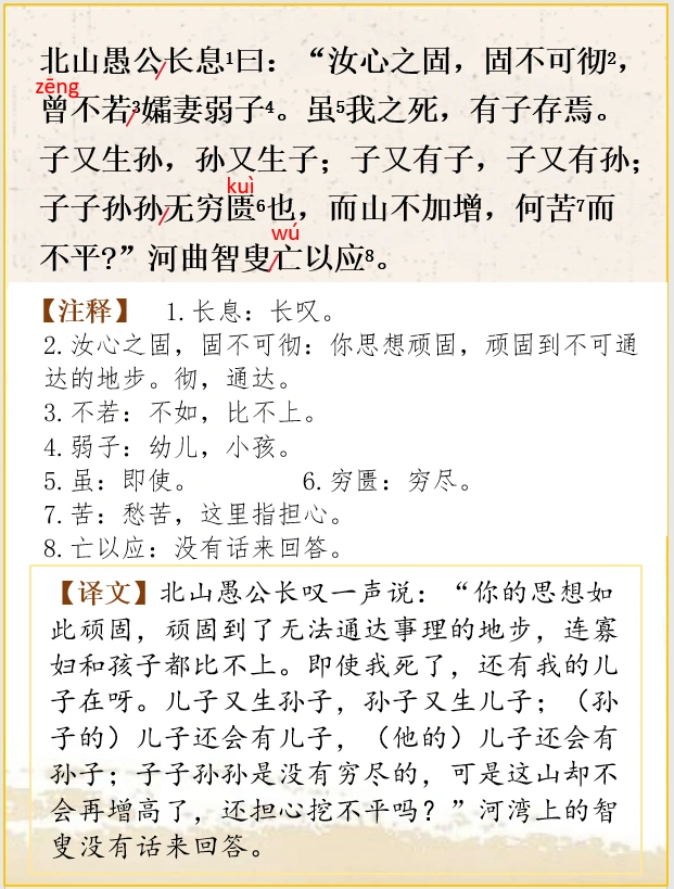 北山脚下有个名叫愚公的人,年纪将近九十岁了,面对着大山居住。他苦于山北面道路阻塞,出来进去都要绕远路,就召集全家商量说:“我和你们尽全力铲除险峻的大山,使道路一直通向豫州南部,到达汉水南岸,行吗?”大家纷纷表示赞同。他的妻子提出疑问说:“凭你的力气,连魁父这样的小山丘都不能削减,又能把太行、王屋这两座大山怎么样呢?况且往哪里放置士石呢?” 众人纷纷说道:“把它扔到渤海边上,隐土北面去。”