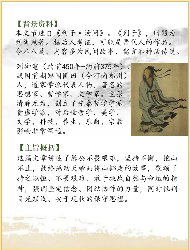 本文选自《列子·汤问》。《列子》,旧题为列御寇著。据后人考证,可能是晋代人的作品。今本八篇,内容多为民间故事、寓言和神话传说。
