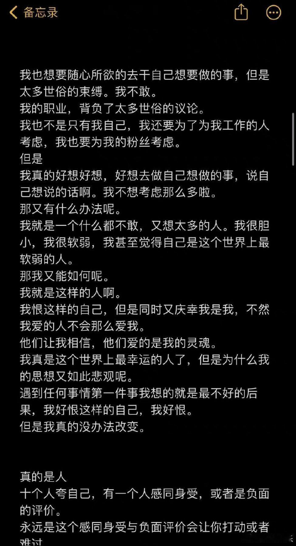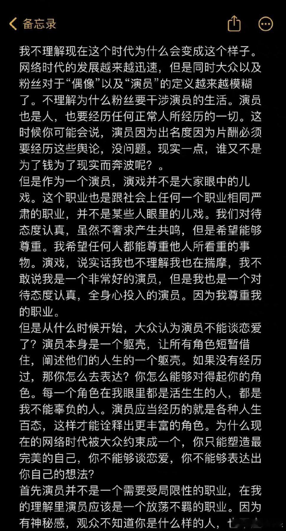 家人们 记不记得向涵之22年发备忘录...以下节选自新浪娱乐:“向涵之晒出备忘录,内容大致是:她认为演员可以恋爱,粉丝不应该干涉演员的生活,“我好想要跟你手拉着手走在马路上。如果要再贪婪一点,我希望我能够穿着婚纱你能够穿着西装然后互相交换戒指。”引发热议后,她晒出一篇文章疑似回应。