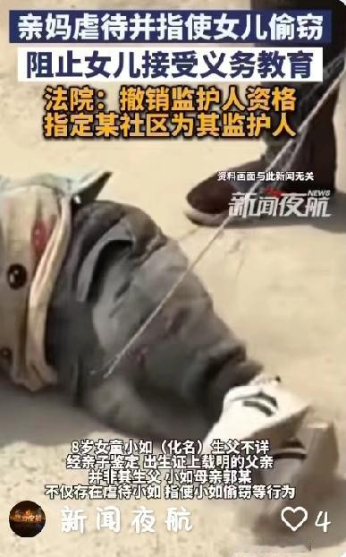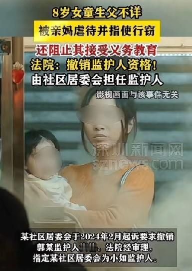 女子指使自己8岁女儿偷窃,还虐待孩子不让她上学!这哪是亲妈,和人贩子有啥区别! 本该是被呵护成长的年纪,8岁女童小如(化名)却长期活在亲生母亲的伤害与操控中。小如的身世很特殊,生父不详,外祖父母也早已去世,母亲郭某成了她唯一的法定监护人。然而这份血缘羁绊,并未带来温暖呵护。郭某不仅对小如实施虐待行为,更将女儿当作牟利工具,多次指使年仅8岁的小如外出偷窃。更令人痛心的是,郭某还公然阻止小如接受义务教育,剥夺了孩子获得知识、改变命运的基本权利,让小如长期处于身心双重受创的危困状态。 社区居委会在日常工作中发现了小如的悲惨境遇,多次尝试介入劝阻,但郭某始终拒不改正。为避免小如的权益持续受到侵害,2024年2月,该社区居委会作为申请人,正式向法院提起诉讼,请求撤销郭某的监护人资格。最终,法院依法作出判决:撤销郭某对小如的监护人资格,并从最有利于被监护人成长的原则出发,指定社区居委会作为小如的监护人。社区居委会委托小如舅妈负责日常照料,采用“监护人+照料人”分离模式,同时由居委会定期探访、支付生活补贴。 作为一个母亲怎么舍得这么对待自己的孩子呢?虐待,逼着偷窃,还不让上学,这行为简直令人发指。每个孩子都应该被呵护,尤其是像小如这样身世本就坎坷的孩子,更需要家庭的温暖和关爱。可郭某却将自己的私欲凌驾于孩子的幸福之上,把无辜的小如拖入了痛苦的深渊。取消监护资格的判决,相信对于孩子来说绝对是一个新的开始。希望这个孩子在居委会的照料下以后能健康成长。