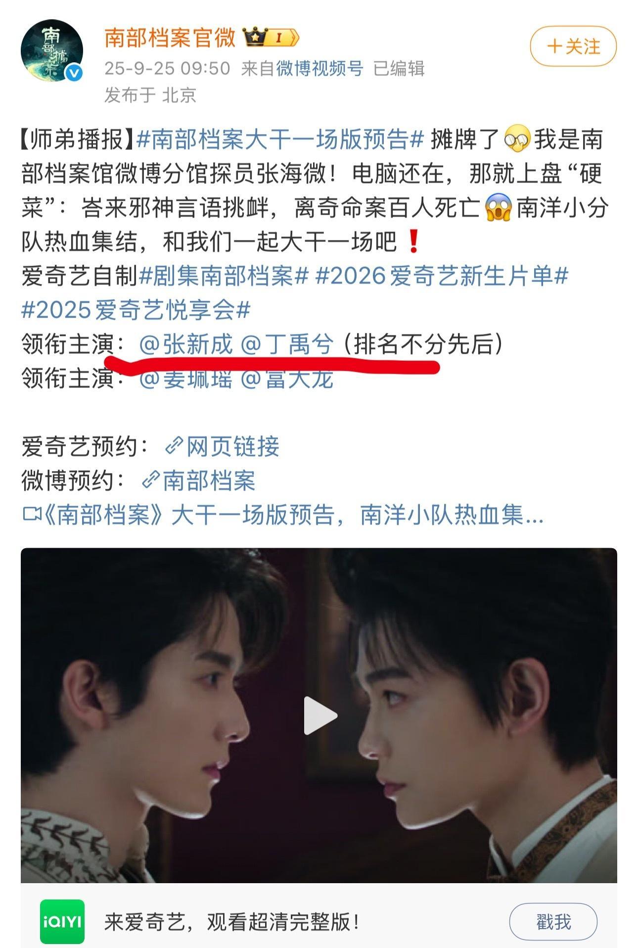 丁禹兮粉丝向爱奇艺和片方维权:要求番位严格按照演员姓名首字母顺序排序(此前一直是张新成在前。)、必须确保丁禹兮作为第一顺位主演的待遇等...并要求爱奇艺官方就此事件公开道歉。 爱奇艺电视剧 南部档案