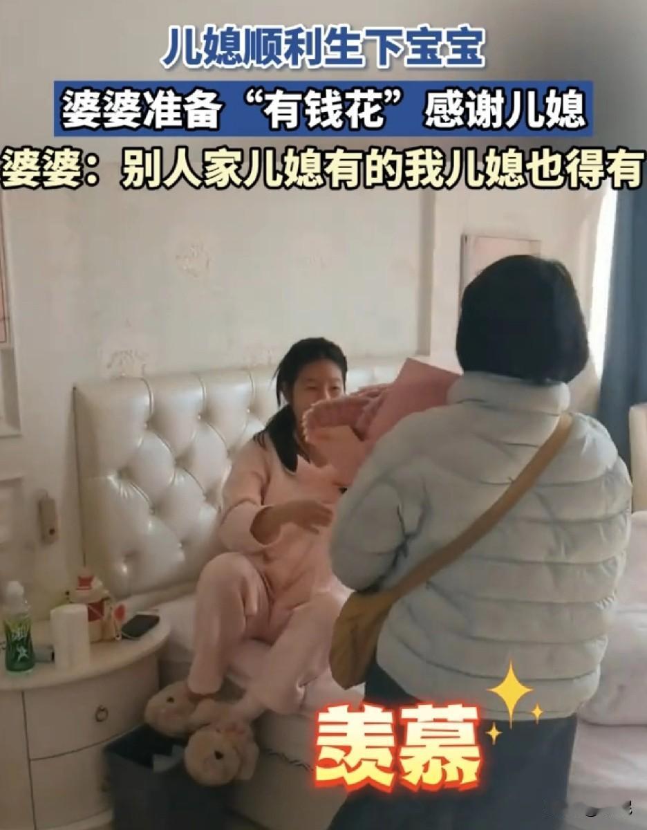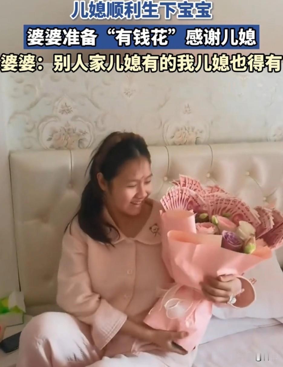 太羡慕,以至于我有点嫉妒。 江苏,一儿媳顺利生下宝宝,婆婆准备了一大束“有钱花”感谢儿媳。婆婆直言:别人家儿媳有的,我儿媳也得有。 别人家有没有,我不知道。但是我就没有,我生了两个都没有。这花,真漂亮,一张张红钞票,毛爷爷在对我笑,有点刺眼。 虽然钱不多,数了下九千的样子,但是这仪式感满满,让人羡慕又嫉妒。 没有对比就没有伤害。哎,关键羡慕嫉妒也没用,这花不是我的,这婆婆也不是我的。 等我有钱了,我儿媳生了,我也包“有钱花”给她,炫耀一下,显摆一下,酸一下别人。不过我儿子才2岁,想远了!