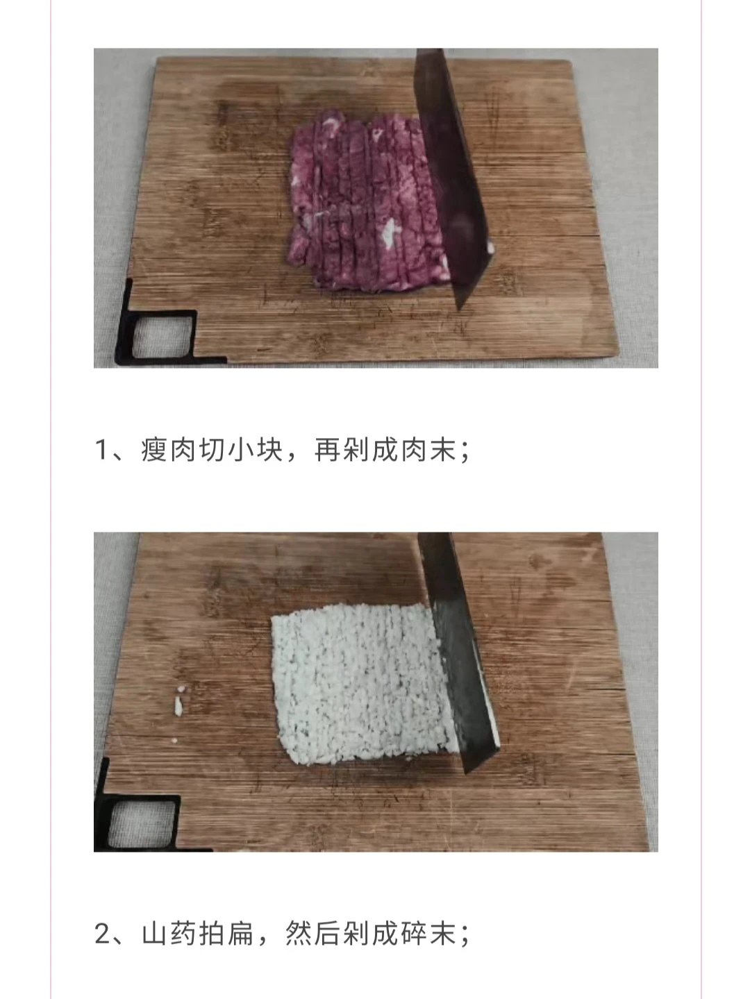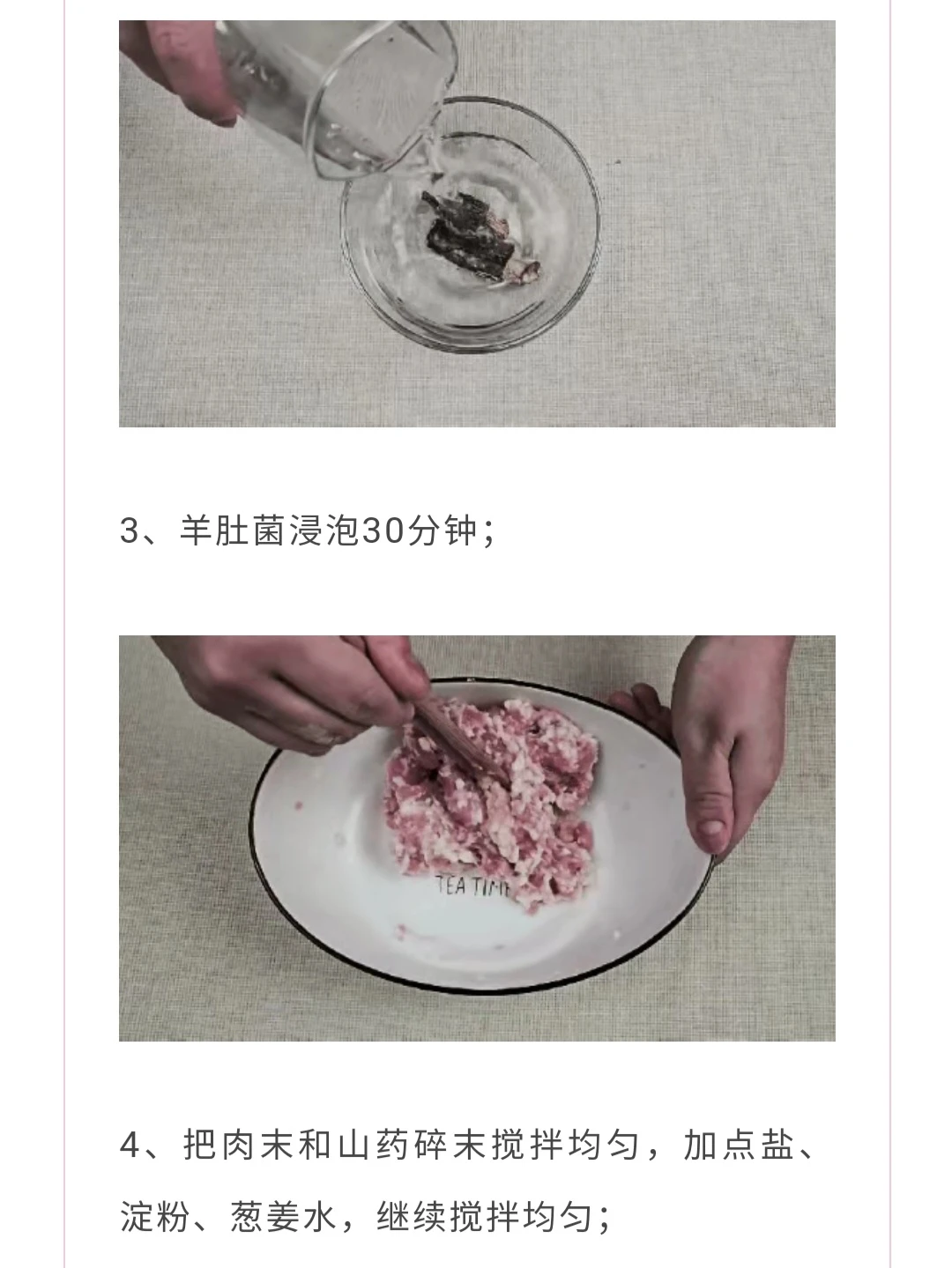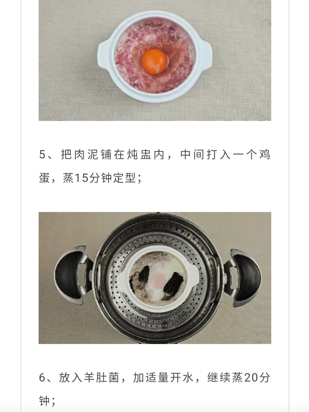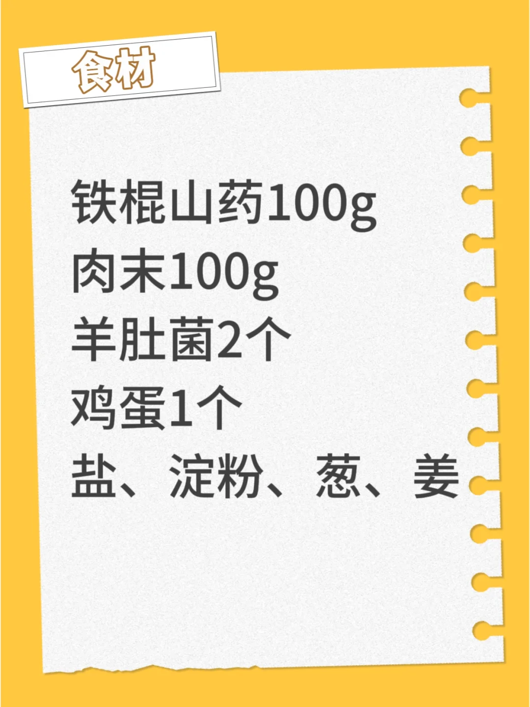 [清单R]原料:铁棍山药100g、肉末100g、羊肚菌2个、鸡蛋1个、盐、淀粉、葱、姜