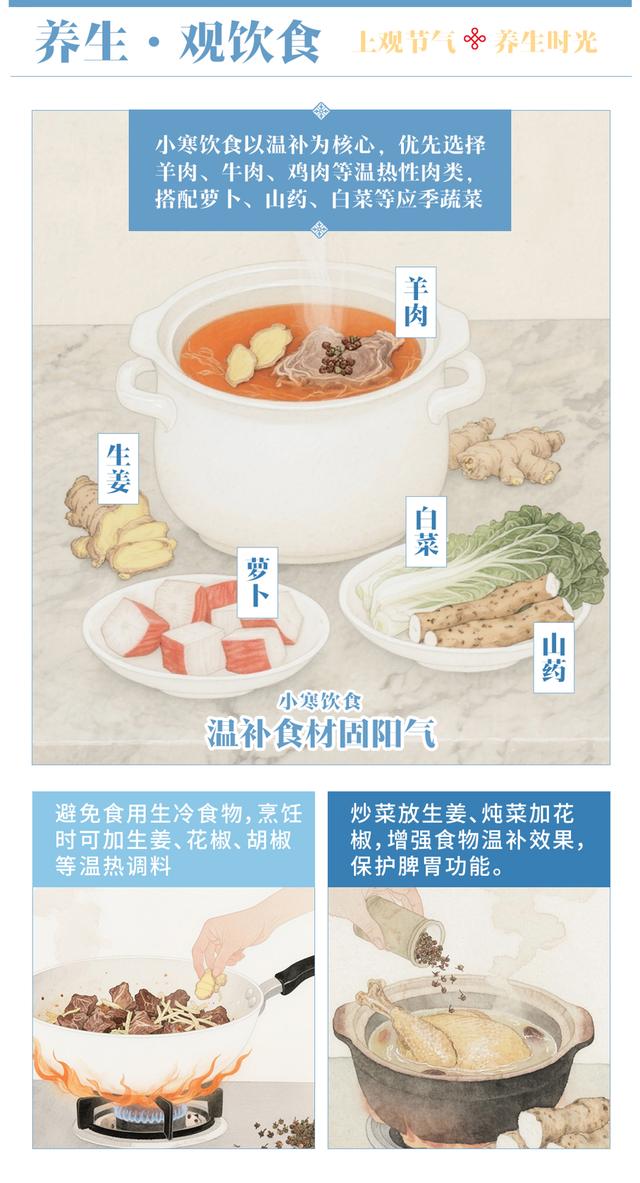 温补食材固阳气。小寒饮食以温补为核心,优先选择羊肉、牛肉、鸡肉等温热性肉类,搭配萝卜、山药、白菜等应季蔬菜。避免食用生冷食物,烹饪时可加生姜、花椒、胡椒等温热调料,如炒菜放生姜、炖菜加花椒,增强食物温补效果,保护脾胃功能。