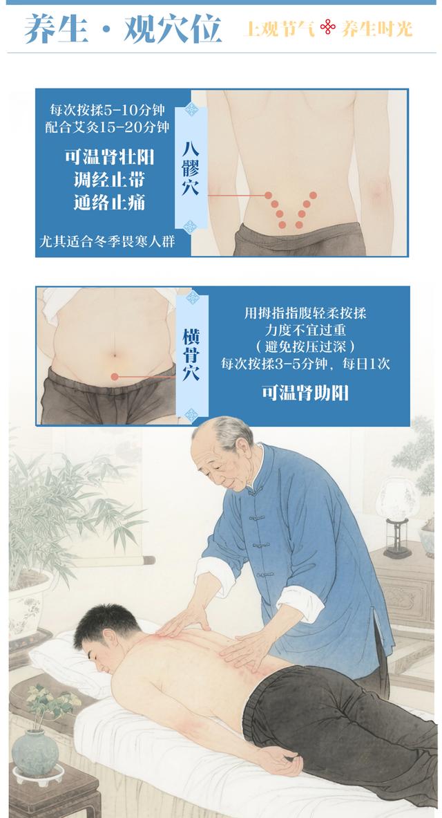 八髎穴:每次按揉5-10分钟;推荐配合艾灸,每次艾灸15-20分钟可温肾壮阳、调经止带、通络止痛,尤其适合冬季畏寒人群。