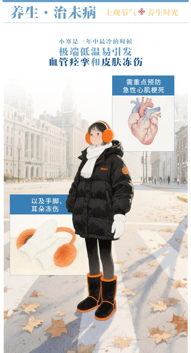 小寒是一年中最冷的时候,极端低温易引发血管痉挛和皮肤冻伤。需重点预防急性心肌梗死,以及手脚、耳朵冻伤。
