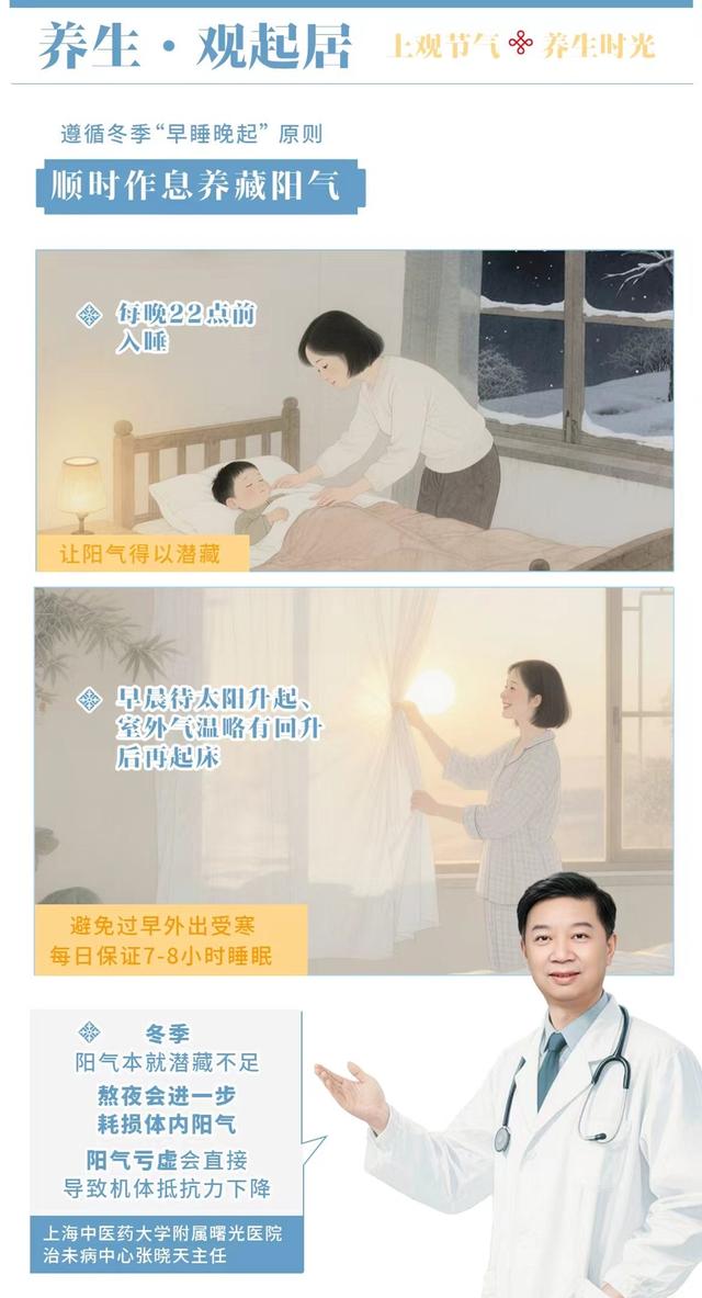 顺时作息养藏阳气。遵循冬季“早睡晚起”原则,每晚22点前入睡,让阳气得以潜藏;早晨待太阳升起、室外气温略有回升后再起床,避免过早外出受寒,每日保证7-8小时睡眠。冬季阳气本就潜藏不足,熬夜会进一步耗损体内阳气,而阳气亏虚会直接导致机体抵抗力下降。