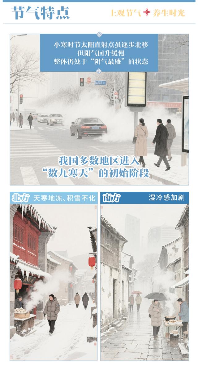 小寒是冬季第五个节气,此时太阳直射点虽逐步北移,但阳气回升缓慢,整体仍处于“阴气最盛”的状态,我国多数地区进入“数九寒天”的初始阶段,北方天寒地冻、积雪不化,南方湿冷感加剧。