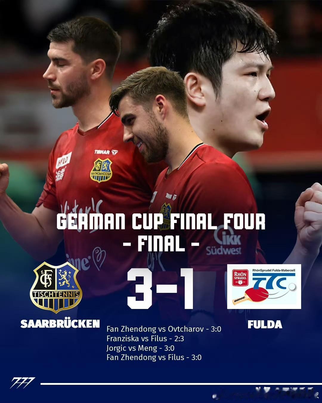 2025/2026赛季乒乓球德国杯 本赛季德国杯半决赛和决赛同日(1.4)进行,半决赛18:00开始,决赛00:54结束,樊振东7小时内4战全胜。 半决赛: 樊振东3比1阿比奥顿 樊振东3比1户上隼辅 决赛: 樊振东3比0迪米特里·奥恰洛夫 樊振东3比0鲁文·菲卢斯。 樊振东所在的萨尔布吕肯俱乐部夺得德国杯冠军! 2026.1.4