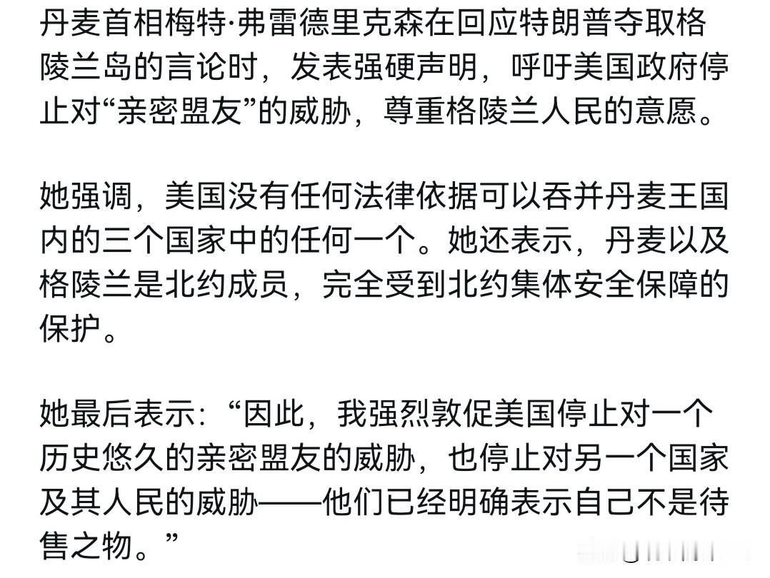 丹麦感到瑟瑟发抖!1月5日,丹麦首相梅特·弗雷德里克森在回应特朗普夺取格陵兰岛的言论时表示,呼吁美国政府停止对“亲密盟友”的威胁,尊重格陵兰人民的意愿。美国没有任何法律依据可以吞并丹麦王国内的三个国家中的任何一个。丹麦以及格陵兰是北约成员,完全受到北约集体安全保障的保护。 因此,我强烈敦促美国停止对一个历史悠久的亲密盟友的威胁,也停止对另一个国家及其人民的威胁——他们已经明确表示自己不是待售之物。很显然,在美国公然侵略委内瑞拉,妄图把委内瑞拉变成是美国的“势力范围”之后,丹麦感到瑟瑟发抖。丹麦此时当然非常清楚,特朗普政府什么事情都可能干出来。 从美国侵略委内瑞拉的逻辑来看,美国根本不在意什么国际法,而完全是依据实力原则。美国国防部长赫格塞思把话说的很直白,赫格塞思表示,正如特朗普总统所言,我们的对手必须清楚,美国有能力在任何时间、任何地点投射其意志。也就是说,当美国想这样做的时候,美国一定做的到。因此,现实的情况是,美国有没有法律依据并不重要,重要的是,美国打不打算这样做,以现在的情况而言,特朗普不像是仅仅说说而已。
