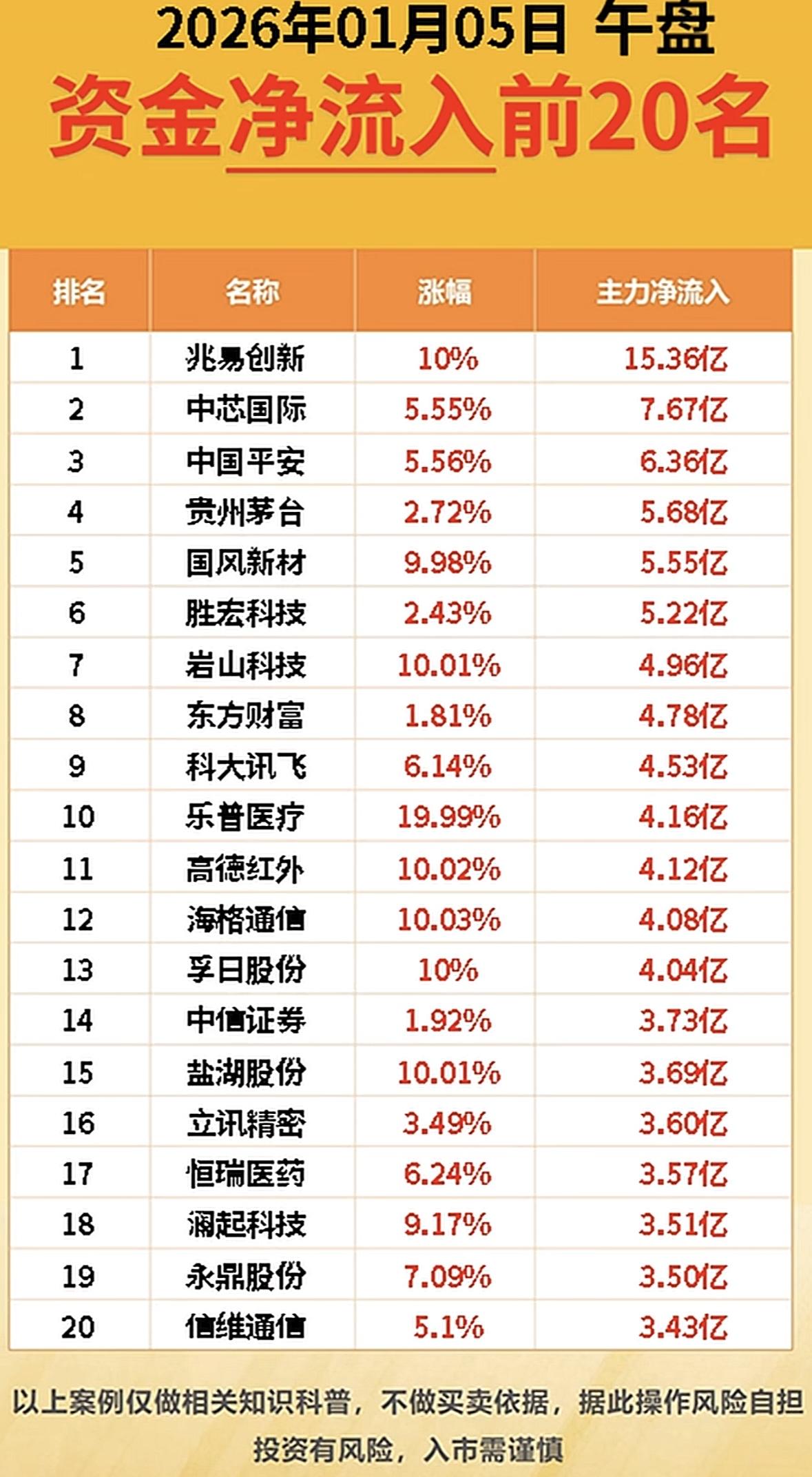 1月5日午盘资金净流入前20名,投资需谨慎! 资金流入榜:兆易创新领跑,中芯国际、茅台等跟涨,科技医疗板块活跃,投资需谨慎。