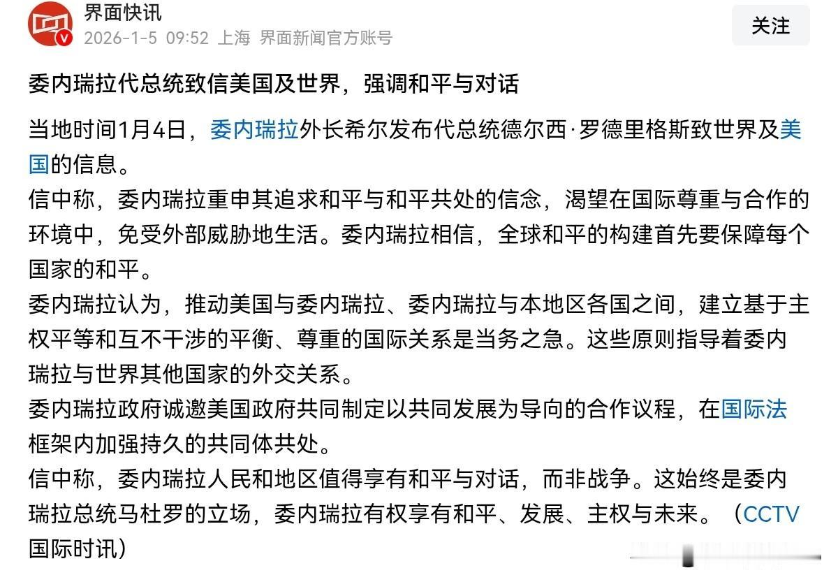 委内瑞拉是一天都没有扛过去,就向美国屈服了!在特朗普表示,如果代总统德尔西·罗德里格斯不做出正确选择,必将付出极其惨重的代价——甚至可能比马杜罗的代价还要大之后,罗德里格声称诚邀美国进行和平对华!1月5日,委内瑞拉外长希尔声称,委内瑞拉重申其追求和平与和平共处的信念,渴望在国际尊重与合作的环境中,免受外部威胁地生活。 委内瑞拉认为,推动美国与委内瑞拉、委内瑞拉与本地区各国之间,建立基于主权平等和互不干涉的平衡、尊重的国际关系是当务之急。委内瑞拉政府诚邀美国政府共同制定以共同发展为导向的合作议程。前脚委内瑞拉总统马杜罗被扣,公然军事侵略委内瑞拉。后脚委内瑞拉就邀请美国谈以共同发展为导向的合作议程,这真是让人咋舌。 说句不客气的,面对美国的压力,委内瑞拉是一天都没有扛过去。现在我们似乎明白了,为什么特朗普把马查多晾在一边,并放话声称,委内瑞拉现在不是选举的时刻,原来美国真的是另有安排,别具深意。明眼人都看的出来,这就是城下之盟,这就是用炮舰轰开委内瑞拉国门之后的明抢,哪里是谈什么合作事项呢? 怪不得美国留着副总统罗德里格斯,可能美国早就安排好了,此人就是与美国进行谈判最合适的人选。美国要的就是石油,此人不仅是委内瑞拉的副总统,还兼任经济财政部长,石油部长,是一个握有巨大实权,业务能力极熟的人物。让此人牵头相关事宜,那可太熟悉了。所谓的代理人,恐怕这就是代理人。事实证明,只有马杜罗是输家,委内瑞拉人民是输家。