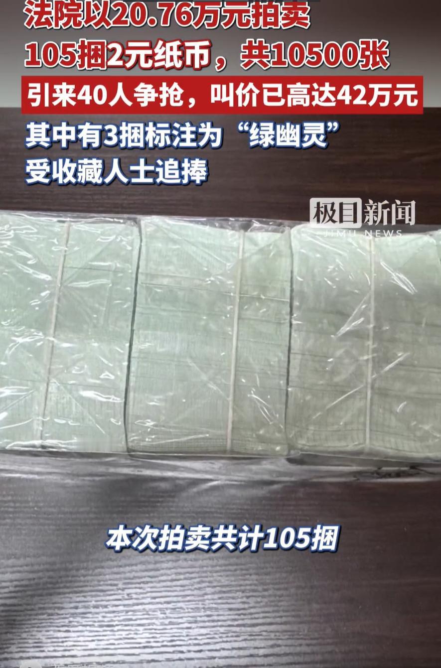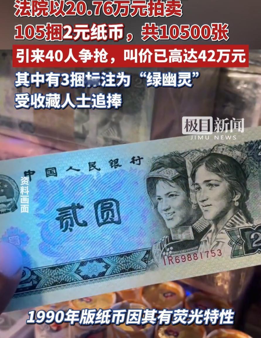 这是真抢手!浙江永嘉县,法院最近在阿里法拍上,挂出了一批特别的拍品:10500张两元面值的人民币,起拍价20.76万。本以为只是走个程序,没想到竟有40个人轮番出价,硬是把价格推到了42万以上。算下来,平均一张两块钱的纸币,已经叫价超过40块。不少网友看后直拍大腿:早知道当年多留点压箱底了! 这事有趣就有趣在,很多人第一反应是:人民币也能拍卖?这不是法定货币吗? 其实法院拍卖的,并不是货币本身的流通价值。这批钱属于第四套人民币中的两元纸币,早在2018年5月1日就已经停止流通了 也就是说,你现在拿它去超市买东西,人家是不会收的。那它值钱在哪呢?在于它的收藏属性 这次拍品分两种版本:1990年版的55捆,和1980年版的50捆。其中有三捆还被特别标注为“绿幽灵”,要知道在收藏圈里,这个版本因为荧光效果独特,数量稀少,行情一直看涨。其它的虽然密封包装没法拆验,但整捆未拆的“原件”状态,在钱币收藏市场本身就意味着品相有保障,溢价空间也大 所以,这早就不再是“花两块钱”的概念,而是彻彻底底的藏品交易。法院处置被执行人财物,只要符合规定,程序公开,拍卖人民币纸币和拍卖其他资产并没有本质区别 我觉得这件事透露出两点信息。一是收藏价值和货币本身的面值区别越来越大。普通人手里的钱在流通中没什么特别,但当它停止流通,成为稀缺品或者完整包装时,价值就会被市场重新认定 二是生活中有些“日常物品”,当它们离开原来的使用场景,就可能变成另类的投资或收藏。像这次拍卖,2元纸币从支付工具变成了拍卖品,价格比面值高出几十倍,足以让人反思平时随手丢弃或者不当回事的东西,可能在别人眼里正是宝贝