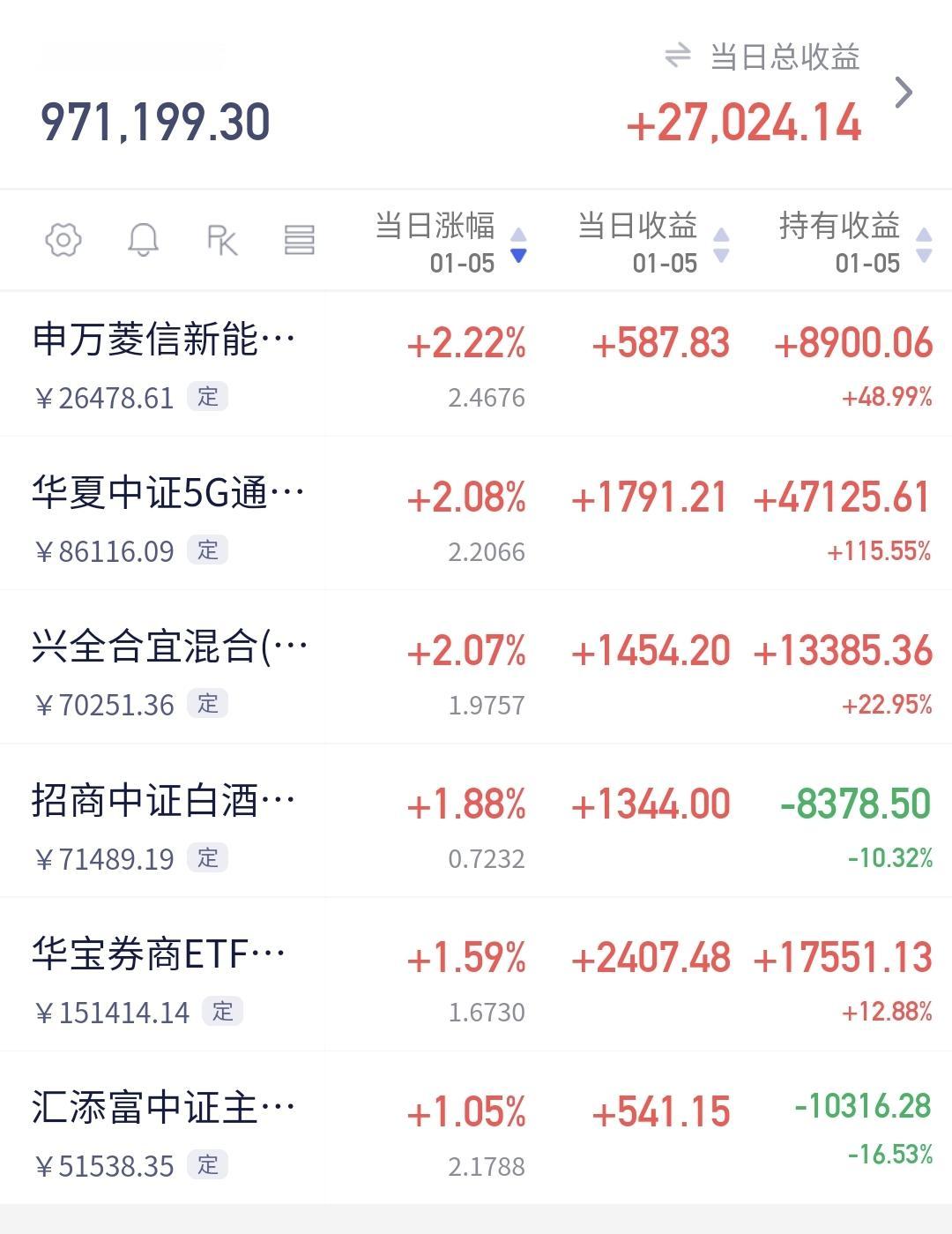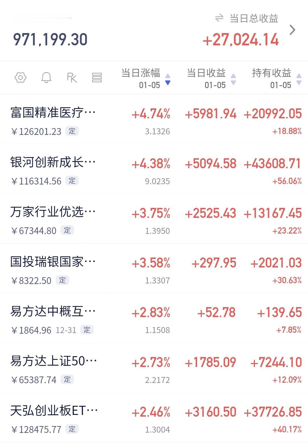 基金:今天的加仓和减仓板块 日本和韩国市场今天大涨,日本上涨了3.08%,韩国上涨了3.15%,上涨幅度都超过了3%以上。 香港市场今天是下跌,恒生指数下跌了0.06%,国企指数下跌了0.25%,恒生科技指数下跌了0.31%,下跌幅度都很小。 图3是今天基金的加仓排行榜,图4是今天基金的减仓排行榜,图5是今天基金的持有人数飙升榜,图6是今天基金的加仓人数和减仓人数,今天加仓9489961人,今天减仓6226675人,今天加仓人数超过了减仓人数。 我们再来看一下盘面情况,看下面的截图7,现在市场上涨4062家,下跌1261家,涨停113家,跌停11家,两市累计成交20224亿,相比于上个交易日放量了25%,这样的放量幅度是可以的。 我们来看一下下面的截图8,这是主力资金进出板块的情况,主力资金净流入最多的三个板块是:蓝筹策略板块,esg板块,信息技术板块,主力资金净流出最多的三个板块是:新能源板块,通信设备板块,通信板块。 我们来看一下今天主力资金净流出最多的新能源板块的情况,看下面的截图9,这是新能源板块日K线图,从图中可以看出,我画了两条平行的斜线,稍微倾斜向上,这是新能源板块日线级别横盘震荡通道,现在的位置还处于这个震荡通道之内,今天的震荡并没有改变这个板块的震荡走势。 我们来看一下下面的截图10,这是新能源板块周K线图,从图中可以看出,我画了两条倾斜向上的斜线,这是新能源板块周线级别上涨通道,前段时间已经跌破了这个上涨通道的下轨,现在是处于有效破位中。 新能源板块日线级别方向不明,周线级别处于上涨趋势破位中,所以,这个板块进场需要谨慎,需要耐心等待短期方向的确定。 人工智能板块今天表现也是不错,上涨幅度超过了3%。我们来看一下下面的截图11,这是人工智能板块日K线图,从图中可以看出,我画了一条倾斜向下的斜线,这是人工智能板块日线级别短期下跌趋势线。去年的最后一个交易日上涨突破了这条下跌趋势线,今天继续向上上涨,是对这个突破的确认。 我们来看一下下面的截图12,这是人工智能板块周K线图,从图中可以看出,我画了一条倾斜向下的斜线,这是人工智能板块周线级别下跌趋势线。今天的上涨突破了这条下跌趋势线,也就是说,人工智能板块周线级别下跌趋势有可能已经被改变。 有色金属板块,今天的表现也是不错,现在盘中估值上涨了2%以上,我们来看一下下面的截图13,这是有色金属板块日K线图,从图中可以看出,我画了两条倾斜向上的斜线,这是有色金属板块日线级别上涨通道,现在的位置处于这个上涨通道内,也就是说,有色金属板块日线级别处于上涨趋势中,持有的人可以继续持有。 我们来看一下下面的截图14,这是有色金属板块周K线图,从图中可以看出,我画了两条倾斜向上的斜线,这是有色金属板块周线级别上涨通道,今天的上涨已经来到了上涨通道的上轨线上,也就是说,现在已经碰到了阻力位置,近期观察能不能突破上涨通道的上轨。 有色金属板块,日线级别和周线级别都是向上,这样的情况下,持有的人可以继续持有,除非跌破上涨通道的下轨,或者是进入加速上涨的后期,才可以考虑要不要止盈出来观望。 持有的基金中,现在盘中估值全部都是上涨,上涨幅度最大的三个板块是:医疗板块,芯片半导体板块,大科技混合,上涨幅度最小的三个板块是:大消费板块,证券板块,白酒板块,估值整体上涨了27024元。 今天是2026年的第一个交易日,来了一个开门红,我们每个人都拿到了红包,祝大家2026年投资顺利,祝大家2026年持有的基金大涨! 今天究竟应该怎么办?我会在评论区留言。 我每天都会分享我的观点,我的观点只代表我个人的看法,不能作为你操作的依据,据此操作后果自负。