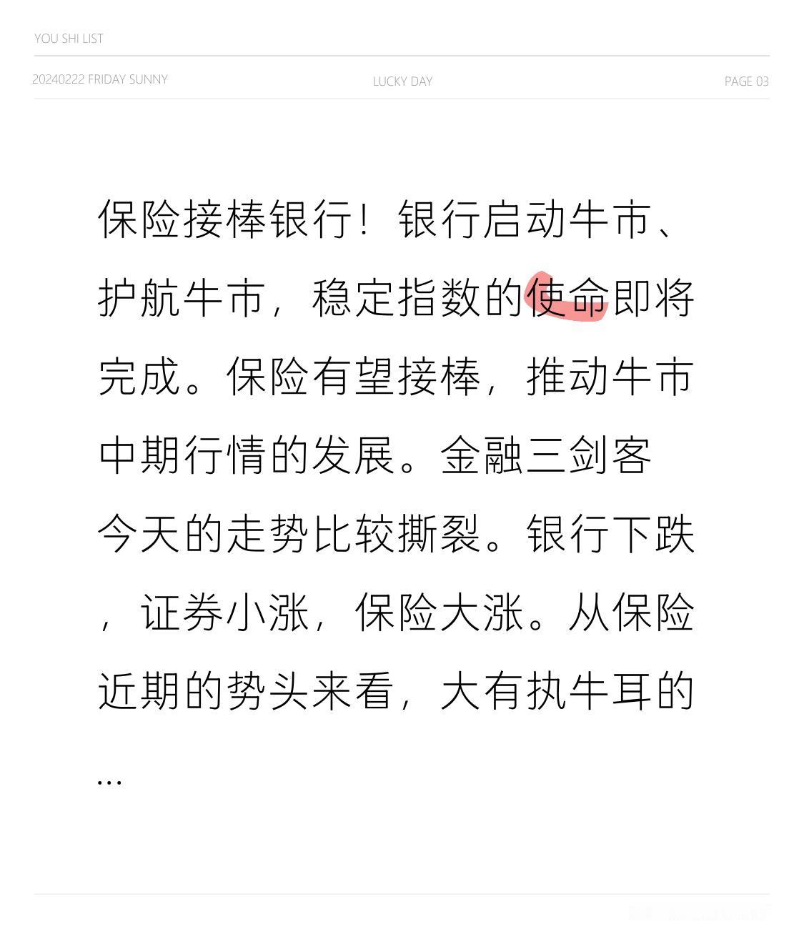 保险接棒银行! 银行启动牛市、护航牛市,稳定指数的使命即将完成。保险有望接棒,推动牛市中期行情的发展。 金融三剑客今天的走势比较撕裂。银行下跌,证券小涨,保险大涨。从保险近期的势头来看,大有执牛耳的感觉。 持有保险股的,别乱动;没有保险股的,别眼馋,静待回调。股市最不缺的就是机会,比如现在的证券,还不高,大概率会是牛市后期的领头羊。